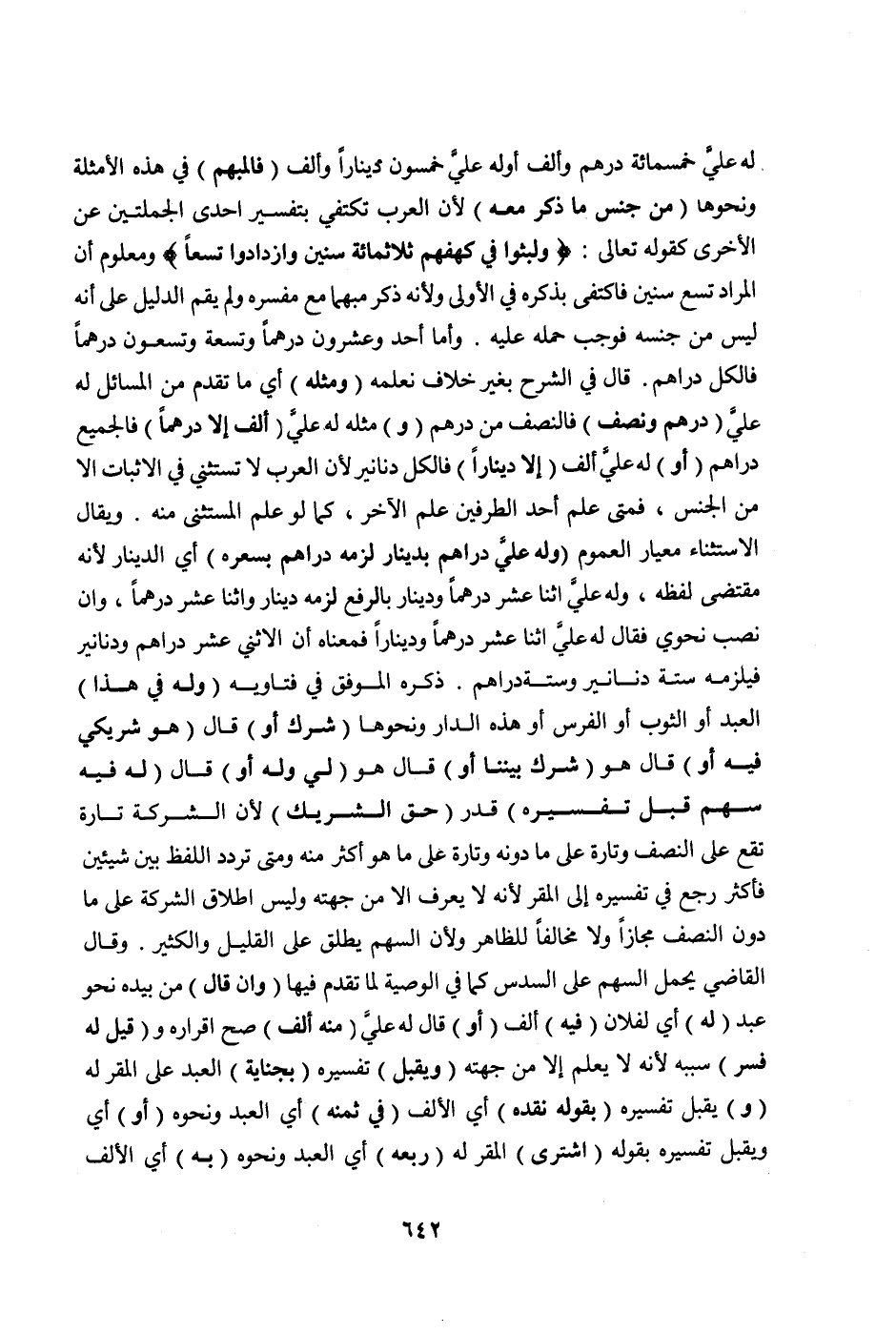 لَهُ عَلَيَّ خَمْسِمِائَةٍ دِرْهَمٍ وَأَلْفٌ أَوْ لَهُ عَلَيَّ خَمْسُونَ دِينَارًا وَأَلْفٌ (فَالْمُبْهَمُ) فِي هَذِهِ الْأَمْثِلَةِ وَنَحْوِهَا (مِنْ جِنْسِ مَا ذُكِرَ مَعَهُ) لِأَنَّ الْعَرَبَ تَكْتَفِي بِتَفْسِيرِ إحْدَى الْجُمْلَتَيْنِ عَنْ الْأُخْرَى كَقَوْلِهِ تَعَالَى: {وَلَبِثُوا فِي كَهْفِهِمْ ثَلَاثَ مِائَةٍ سِنِينَ وَازْدَادُوا تِسْعًا} [الكهف: ٢٥] وَمَعْلُومٌ أَنَّ الْمُرَادَ تِسْعُ سِنِينَ فَاكْتَفَى بِذِكْرِهِ فِي الْأُولَى وَلِأَنَّهُ ذَكَرَ مُبْهَمًا مَعَ مُفَسَّرِهِ وَلَمْ يُقِمْ الدَّلِيلَ عَلَى أَنَّهُ لَيْسَ مِنْ جِنْسِهِ فَوَجَبَ حَمْلُهُ عَلَيْهِ.