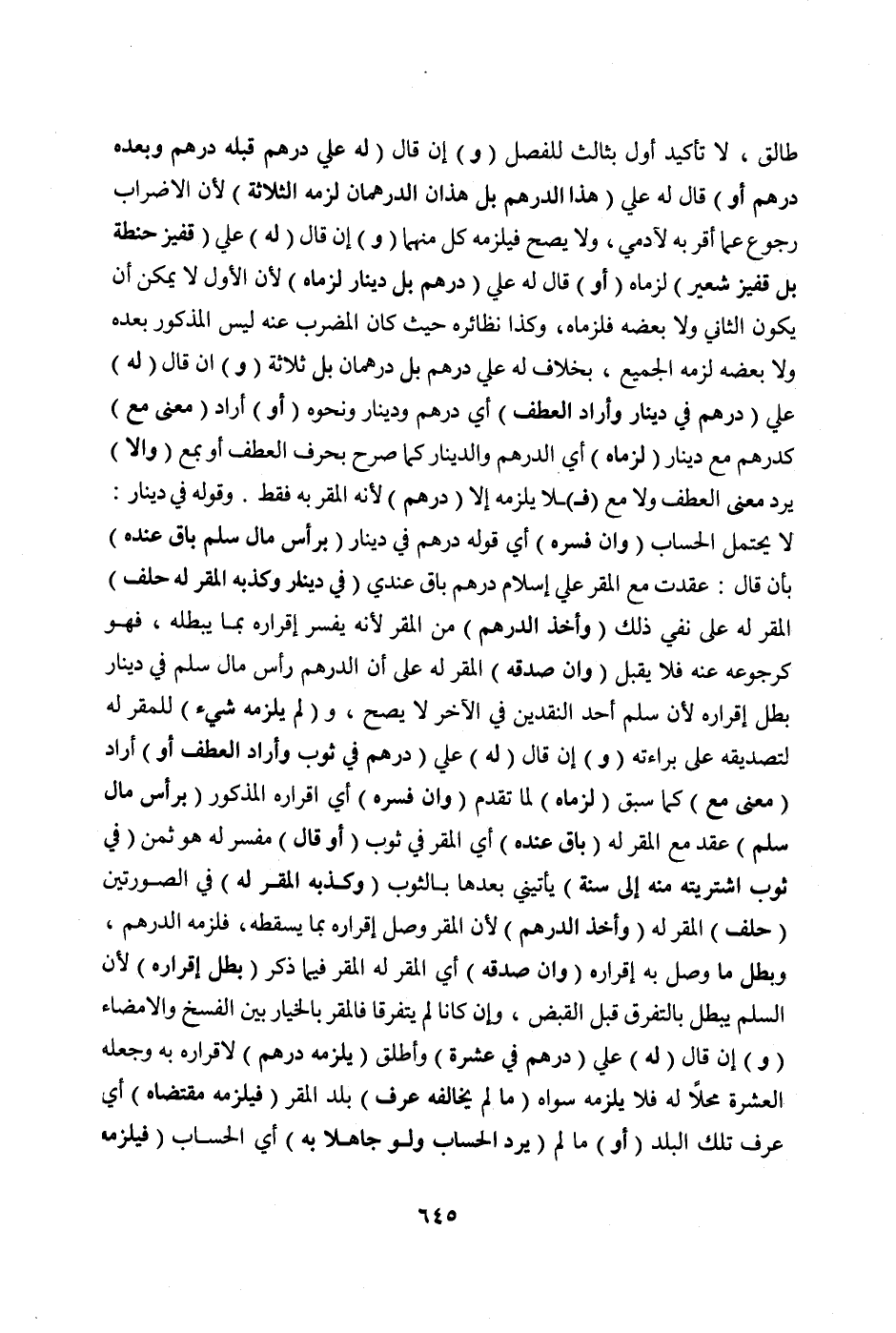 (وَ) إنْ قَالَ (لَهُ) عَلَيَّ (دِرْهَمٌ فِي دِينَارٍ وَأَرَادَ الْعَطْفَ) أَيْ دِرْهَمٌ وَدِينَارٌ وَنَحْوُهُ (أَوْ) أَرَادَ (مَعْنَى مَعَ) كَدِرْهَمٍ مَعَ دِينَارٍ (لَزِمَاهُ) أَيْ الدِّرْهَمَ وَالدِّينَارَ كَمَا صَرَّحَ بِحَرْفِ الْعَطْفِ أَوْ بِمَعَ (وَإِلَّا) يُرِدْ مَعْنَى الْعَطْفِ وَلَا مَعَ (فَ) لَا يَلْزَمُهُ إلَّا (دِرْهَمٌ) لِأَنَّهُ الْمُقِرُّ بِهِ فَقَطْ. وَقَوْلُهُ فِي دِينَارٍ: لَا يَحْتَمِلُ الْحِسَابَ (وَإِنْ فَسَّرَهُ) أَيْ قَوْلَهُ دِرْهَمٌ فِي دِينَارٍ (بِرَأْسِ مَالِ سَلَمٍ بَاقٍ عِنْدَهُ) بِأَنْ قَالَ: عَقَدْت مَعَ الْمُقِرِّ عَلَى إسْلَامِ دِرْهَمٍ بَاقٍ عِنْدِي (فِي دِينَارٍ وَكَذَّبَهُ الْمُقِرُّ لَهُ حَلَفَ) الْمُقِرُّ لَهُ عَلَى نَفْيِ ذَلِكَ (وَأَخَذَ الدِّرْهَمَ) مِنْ الْمُقِرِّ لِأَنَّهُ يُفَسِّرُ إقْرَارَهُ بِمَا يُبْطِلُهُ، فَهُوَ كَرُجُوعِهِ عَنْهُ فَلَا يُقْبَلُ (وَإِنْ صَدَّقَهُ) الْمُقِرُّ لَهُ عَلَى أَنَّ الدِّرْهَمَ رَأْسُ مَالٍ سُلِّمَ فِي دِينَارٍ بَطَلَ إقْرَارُهُ لِأَنَّ سَلَمَ أَحَدِ النَّقْدَيْنِ فِي الْآخَرِ لَا يَصِحُّ، وَ (لَمْ يَلْزَمْهُ شَيْءٌ) لِلْمُقِرِّ لَهُ لِتَصْدِيقِهِ عَلَى بَرَاءَتِهِ
