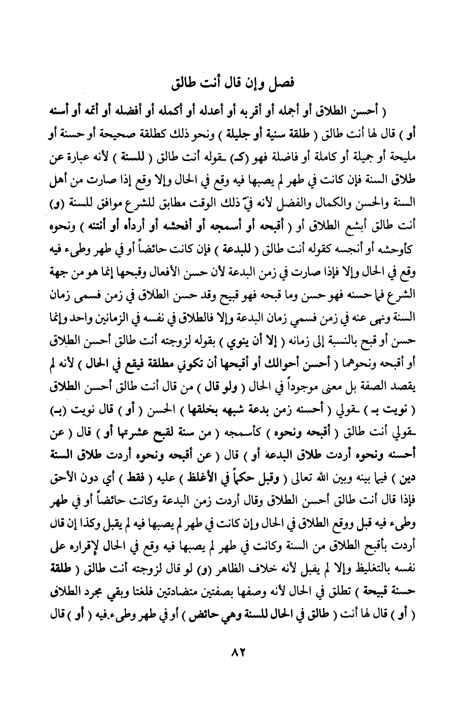 ُ أَوْ أَكْمَلَهُ أَوْ أَفْضَلَهُ أَوْ أَتَمَّهُ أَوْ أَسَنَّهُ أَوْ) قَالَ لَهَا: أَنْتِ طَالِقٌ (طَلْقَةً سُنِّيَّةً أَوْ جَلِيلَةً) وَنَحْوَ ذَلِكَ كَطَلْقَةٍ صَحِيحَةٍ أَوْ حَسَنَةٍ أَوْ مَلِيحَةً أَوْ جَمِيلَةٍ أَوْ كَامِلَةً أَوْ فَاضِلَةً فَهُوَ (كَ) قَوْلِهِ أَنْتِ طَالِقٌ (لِلسُّنَّةِ) ; لِأَنَّهُ عِبَارَةٌ عَنْ طَلَاقِ السُّنَّةِ فَإِنْ كَانَتْ فِي طُهْرٍ لَمْ يُصِبْهَا فِيهِ وَقَعَ فِي الْحَالِ وَإِلَّا وَقَعَ إذَا صَارَتْ مِنْ أَهْلِ السُّنَّةِ، وَالْحُسْنِ وَالْكَمَالُ، وَالْفَضْلِ ; لِأَنَّهُ فِي ذَلِكَ الْوَقْتِ مُطَابِقٌ لِلشَّرْعِ مُوَافِقٌ لِلسُّنَّةِ (وَ) أَنْتِ طَالِقٌ أَبْشَعَ الطَّلَاقِ أَوْ (أَقْبَحَهُ أَوْ أَسْمَجَهُ أَوْ أَفْحَشَهُ أَوْ أَرْدَأَهُ أَوْ أَنْتَنَهُ) وَنَحْوَهُ كَأَوْحَشِهِ أَوْ أَنْجَسِهِ كَقَوْلِهِ: أَنْتِ طَالِقٌ (لِلْبِدْعَةِ) فَإِنْ كَانَتْ حَائِضًا أَوْ فِي طُهْرٍ وَطِئَ فِيهِ وَقَعَ فِي الْحَالِ، وَإِلَّا فَإِذَا صَارَتْ فِي زَمَنِ الْبِدْعَةِ ; لِأَنَّ حُسْنَ الْأَفْعَالِ وَقُبْحَهَا إنَّمَا هُوَ مِنْ جِهَةِ الشَّرْعِ فَمَا حَسَّنَهُ فَهُوَ حَسَنٌ وَمَا قَبَّحَهُ فَهُوَ قَبِيحٌ وَقَدْ حَسَّنَ الطَّلَاقَ فِي زَمَنٍ فَسُمِّيَ زَمَانَ السُّنَّةِ، وَنَهَى عَنْهُ فِي زَمَنٍ فَسُمِّيَ زَمَانَ الْبِدْعَةِ وَإِلَّا فَالطَّلَاقُ فِي نَفْسِهِ فِي الزَّمَانَيْنِ وَاحِدٌ وَإِنَّمَا حَسُنَ أَوْ قَبُحَ بِالنِّسْبَةِ إلَى زَمَانِهِ (إلَّا أَنْ يَنْوِيَ) بِقَوْلِهِ لِزَوْجَتِهِ: أَنْتِ طَالِقٌ أَحْسَنَ الطَّلَاقِ أَوْ أَقْبَحَهُ وَنَحْوَهُمَا (أَحْسَنَ أَحْوَالِك أَوْ أَقْبَحَهَا أَنْ تَكُونِي مُطَلَّقَةً فَيَقَعَ فِي الْحَالِ) ; لِأَنَّهُ لَمْ يَقْصِدْ الصِّفَةَ بَلْ مَعْنًى مَوْجُودًا فِي الْحَالِ (وَلَوْ قَالَ) مَنْ قَالَ: أَنْتِ طَالِقٌ أَحْسَنَ الطَّلَاقِ (نَوَيْت بِ) قَوْلِي (أَحْسَنَهُ زَمَنَ بِدْعَةٍ شَبَّهَهُ بِخُلُقِهَا) الْحَسَنِ (أَوْ) قَالَ: نَوَيْت (بِ) قَوْلِي أَنْتِ طَالِقٌ (أَقْبَحَهُ وَنَحْوَهُ) كَأَسْمَجِهِ (مِنْ سُنَّةٍ لِقُبْحِ عِشْرَتِهَا أَوْ) قَالَ (عَنْ أَحْسَنِهِ وَنَحْوِهِ أَرَدْتُ طَلَاقَ الْبِدْعَةِ أَوْ) قَالَ (عَنْ أَقْبَحِهِ وَنَحْوِهِ أَرَدْتُ طَلَاقَ السُّنَّةِ دِينَ) فِيمَا بَيْنَهُ، وَبَيْنَ اللَّهِ تَعَالَى (، وَقُبِلَ حُكْمًا فِي الْأَغْلَظِ) عَلَيْهِ (فَقَطْ) أَيْ: دُونَ الْأَحَقِّ فَإِذَا قَالَ أَنْتِ: طَالِقٌ أَحْسَنَ الطَّلَاقِ،، وَقَالَ: أَرَدْتُ زَمَنَ الْبِدْعَةِ، وَكَانَتْ حَائِضًا أَوْ فِي طُهْرٍ وَطِئَ فِيهِ قُبِلَ، وَوَقَعَ الطَّلَاقُ فِي الْحَالِ وَإِنْ كَانَتْ فِي طُهْرٍ لَمْ يُصِبْهَا فِيهِ لَمْ يُقْبَلْ وَكَذَا إنْ قَالَ أَرَدْتُ بِأَقْبَحِ الطَّلَاقِ مِنْ السُّنَّةِ وَكَانَتْ فِي طُهْرٍ لَمْ يُصِبْهَا فِيهِ وَقَعَ فِي الْحَالِ لِإِقْرَارِهِ عَلَى نَفْسِهِ بِالتَّغْلِيظِ وَإِلَّا لَمْ يُقْبَلْ ; لِأَنَّهُ خِلَافُ الظَّاهِرِ.