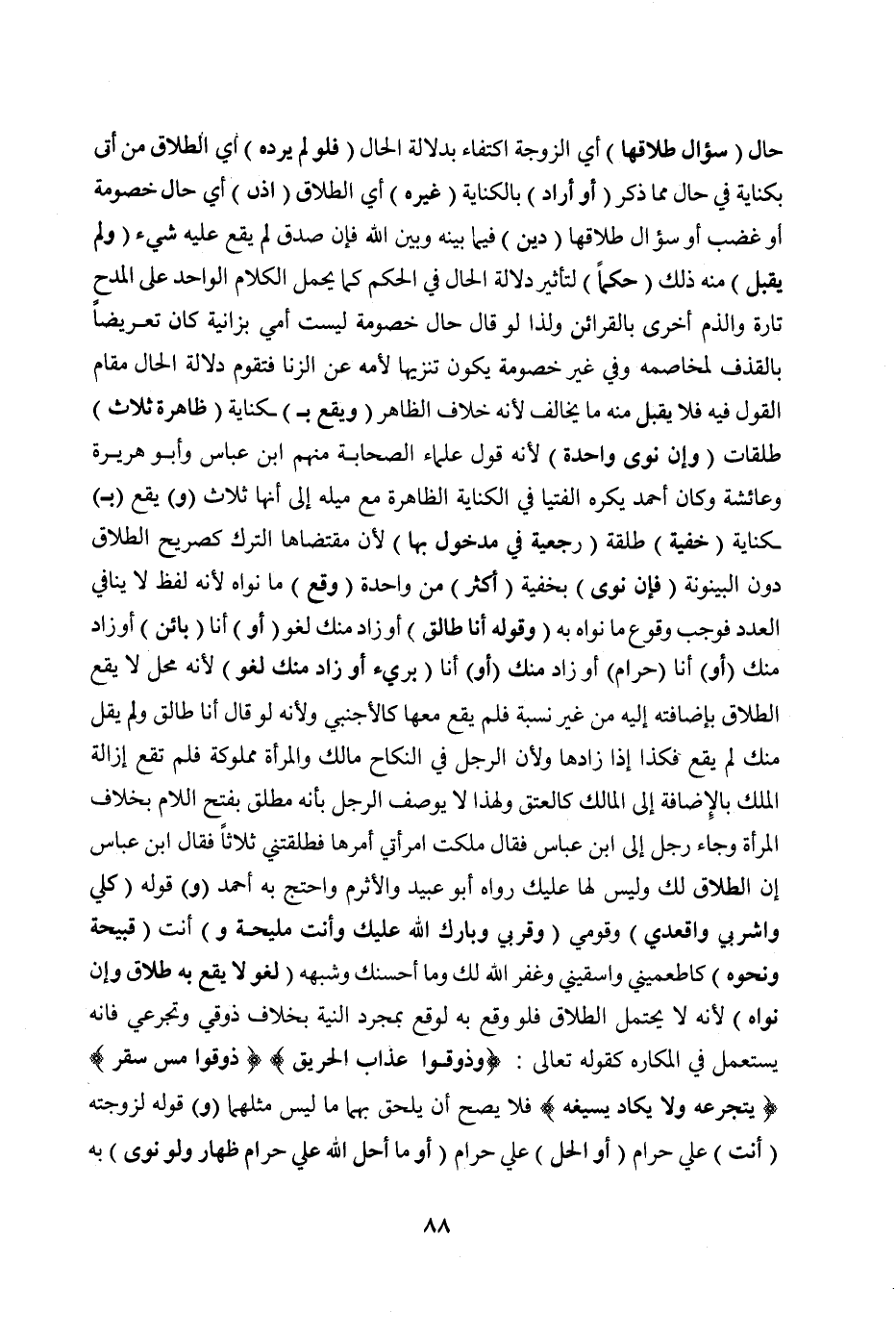 حَالَ (سُؤَالِ طَلَاقِهَا) أَيْ: الزَّوْجَةِ اكْتِفَاءً بِدَلَالَةِ الْحَالِ (فَلَوْ لَمْ يُرِدْهُ) أَيْ: الطَّلَاقَ مَنْ أَتَى بِكِنَايَةٍ فِي حَالٍ مِمَّا ذُكِرَ (أَوْ أَرَادَ) بِالْكِنَايَةِ (غَيْرَهُ) أَيْ: الطَّلَاقَ (إذَنْ) أَيْ: حَالَ خُصُومَةٍ أَوْ غَضَبٍ أَوْ سُؤَالِ طَلَاقِهَا (دُيِّنَ) فِيمَا بَيْنَهُ، وَبَيْنَ اللَّهِ فَإِنْ صَدَقَ لَمْ يَقَعْ عَلَيْهِ شَيْءٌ (وَلَمْ يُقْبَلْ) مِنْهُ ذَلِكَ (حُكْمًا) لِتَأْثِيرِ دَلَالَةِ الْحَالِ فِي الْحُكْمِ كَمَا يُحْمَلُ الْكَلَامُ الْوَاحِدِ عَلَى الْمَدْحِ تَارَةً، وَالذَّمِّ أُخْرَى بِالْقَرَائِنِ وَلِذَا لَوْ قَالَ حَالَ خُصُومَةٍ لَيْسَتْ أُمِّي بِزَانِيَةٍ كَانَ تَعْرِيضًا بِالْقَذْفِ لِمُخَاصِمِهِ، وَفِي غَيْرِ خُصُومَةٍ يَكُونُ تَنْزِيهًا لِأُمِّهِ عَنْ الزِّنَا فَتَقُومَ دَلَالَةُ الْحَالِ مَقَامَ الْقَوْلِ فِيهِ فَلَا يُقْبَلُ مِنْهُ مَا يُخَالِفُ ; لِأَنَّهُ خِلَافُ الظَّاهِرِ.