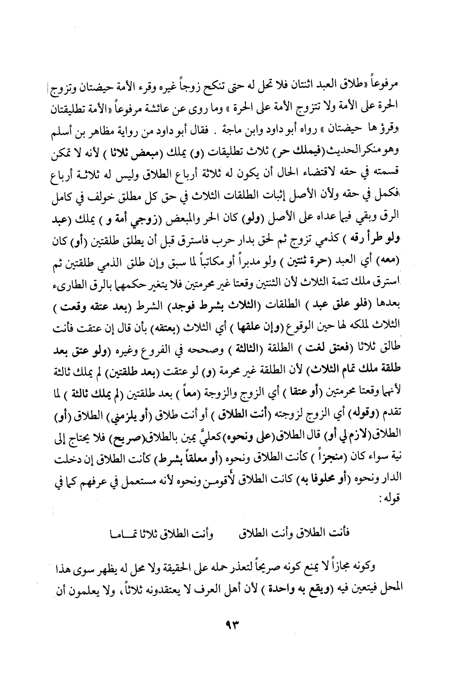 مَرْفُوعًا «طَلَاقُ الْعَبْدِ اثْنَتَانِ فَلَا تَحِلُّ لَهُ حَتَّى تَنْكِحَ زَوْجًا غَيْرَهُ، وَقُرْءُ الْأَمَةِ حَيْضَتَانِ، وَتُزَوَّجُ الْحُرَّةُ عَلَى الْأَمَةِ وَلَا تَتَزَوَّجُ الْأَمَةُ عَلَى الْحُرَّةِ» وَمَا رُوِيَ عَنْ عَائِشَةَ مَرْفُوعًا «الْأَمَةُ تَطْلِيقَتَانِ، وَقُرْؤُهَا حَيْضَتَانِ» رَوَاهُ أَبُو دَاوُد، وَابْنُ مَاجَهْ. فَقَالَ أَبُو دَاوُد مِنْ رِوَايَةِ مُظَاهِرِ بْنِ أَسْلَمَ وَهُوَ مُنْكَرُ الْحَدِيثِ (فَيَمْلِكُ حُرٌّ) ثَلَاثَ تَطْلِيقَاتٍ (وَ) يَمْلِكُ (مُبَعَّضٌ ثَلَاثًا) ; لِأَنَّهُ لَا تُمْكِنُ قِسْمَتُهُ فِي حَقِّهِ لِاقْتِضَاءِ الْحَالِ أَنْ يَكُونَ لَهُ ثَلَاثَةُ أَرْبَاعِ الطَّلَاقِ وَلَيْسَ لَهُ ثَلَاثَةُ أَرْبَاعٍ فَكَمُلَ فِي حَقِّهِ ; وَلِأَنَّ الْأَصْلَ إثْبَاتُ الطَّلْقَاتِ الثَّلَاثِ فِي حَقِّ كُلِّ مُطَلَّقٍ خُولِفَ فِي كَامِلِ الرِّقِّ، وَبَقِيَ فِيمَا عَدَاهُ عَلَى الْأَصْلِ (وَلَوْ) كَانَ الْحُرُّ، وَالْمُبَعَّضُ (زَوْجَيْ أَمَةٍ، وَ) يَمْلِكُ (عَبْدٌ وَلَوْ طَرَأَ رِقُّهُ) كَذِمِّيٍّ تَزَوَّجَ ثُمَّ لَحِقَ بِدَارِ حَرْبٍ فَاسْتُرِقَّ قَبْلَ أَنْ يُطَلِّقَ طَلْقَتَيْنِ (أَوْ) كَانَ (مَعَهُ) أَيْ: الْعَبْدِ (حُرَّةٌ ثِنْتَيْنِ) وَلَوْ مُدَبَّرًا أَوْ مُكَاتَبًا لِمَا سَبَقَ وَإِنْ طَلَّقَ الذِّمِّيُّ طَلْقَتَيْنِ ثُمَّ اُسْتُرِقَّ مَلَكَ تَتِمَّةَ الثَّلَاثِ ; لِأَنَّ الثِّنْتَيْنِ وَقَعَتَا غَيْرَ مُحَرَّمَتَيْنِ فَلَا يَتَغَيَّرُ حُكْمُهُمَا بِالرِّقِّ الطَّارِئِ بَعْدَهَا.