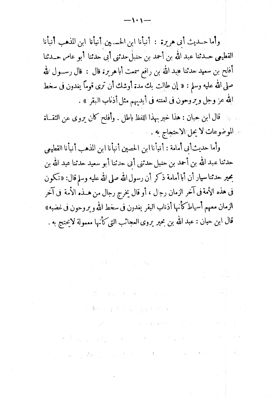وَأما حَدِيث أبي هُرَيْرَة: أَنْبَأَنَا ابْنُ الْحُسَيْن أَنْبَأَنَا ابْنُ الْمُذْهِبِ أَنبأَنَا القطيعى حَدثنَا عبد الله بْنُ أَحْمَدَ بْنِ حَنْبَلٍ حَدَّثَنِي أَبِي حَدَّثَنَا أَبُو عَامِرٍ حَدَّثَنَا أَفْلح بن سعيد حَدثنَا عبد الله بْنُ رَافِعٍ سَمِعْتُ أَبَا هُرَيْرَةَ قَالَ: قَالَ رَسُول الله صَلَّى اللَّهُ عَلَيْهِ وَسَلَّمَ: " إِنْ طَالَتْ بك مُدَّة أَو شكّ أَنْ تَرَى قَوْمًا يَغْدُونَ فِي سخط الله عزوجل وَيَرُوحُونَ فِي لَعْنَتِهِ فِي أَيْدِيهِمْ مِثْلُ أَذْنَابِ الْبَقَرِ ".