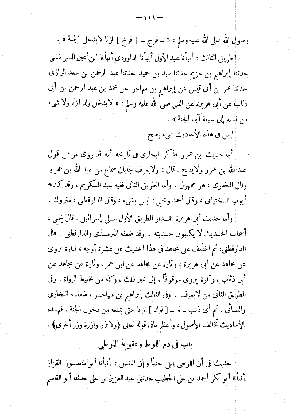 الطَّرِيق الثَّالِث: أَنْبَأَنَا عَبْدُ الأَوَّلِ أَنْبَأَنَا الداوودى أَنْبَأَنَا ابْنُ أَعْيَنَ السَّرَخْسِيُّ حَدَّثَنَا إِبْرَاهِيمُ بْنُ خُزَيْمٍ حَدَّثَنَا عَبْدُ بن حميد حَدثنَا عبد الرحمن بْنُ سَعْدٍ الرَّازِيُّ حَدَّثَنَا عُمَرُ بْنُ أَبِي قَيْسٍ عَنْ إِبْرَاهِيمَ بْنِ مُهَاجِرٍ عَنْ مُحَمَّدِ بْنِ عبد الرحمن بْنِ أَبِي ذِئَابٍ عَنْ أَبِي هُرَيْرَة عَن النَّبِي صَلَّى اللَّهُ عَلَيْهِ وَسَلَّمَ: " لَا يَدْخُلُ وَلَدُ الزِّنَا وَلَا شئ مِنْ نَسْلِهِ إِلَى سَبْعَةِ آبَاءٍ الْجَنَّةَ ".