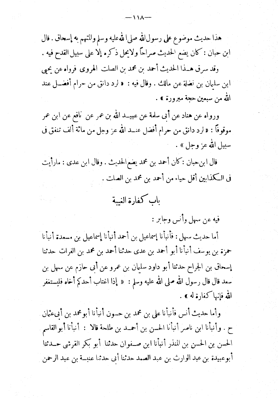 أما حَدِيث سهل: فَأَنْبَأَنَا إِسْمَاعِيلُ بْنُ أَحْمَدَ أَنْبَأَنَا إِسْمَاعِيلُ بْنُ مَسْعَدَةَ أَنْبَأَنَا حَمْزَةُ بْنُ يُوسُفَ أَنْبَأَنَا أَبُو أَحْمَدَ بْنُ عَدِيٍّ حَدَّثَنَا أَحْمَدُ بْنُ مُحَمَّدِ بْنِ الْفُرَاتِ حَدَّثَنَا إِسْحَاقُ بْنُ الْجَرَّاحِ حَدَّثَنَا أَبُو دَاوُدَ سُلَيْمَانُ بْنُ عَمْرٍو عَنْ أَبِي حَازِمٍ عَنْ سَهْلِ بْنِ سَعْدٍ قَالَ قَالَ رَسُول الله صَلَّى اللَّهُ عَلَيْهِ وَسَلَّمَ: " إِذَا اغْتَابَ أَحَدُكُمْ أَخَاهُ فَلْيَسْتَغْفِرِ اللَّهَ فَإِنَّهَا كَفَّارَة لَهُ ".