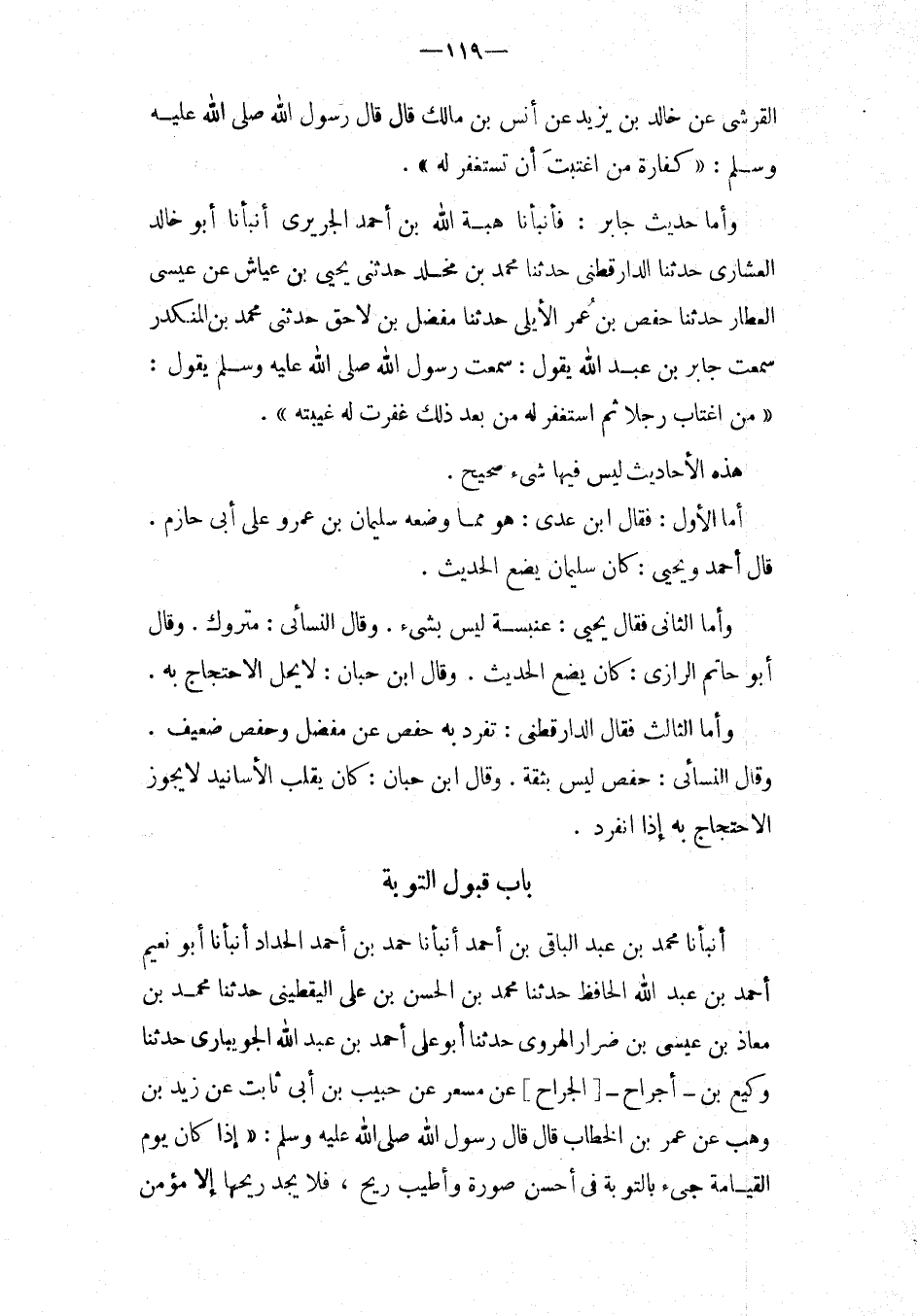 وَأما حَدِيث جَابِر: فَأَنْبَأَنَا هِبَةُ اللَّهِ بْنُ أَحْمَدَ الْجَرِيرِيُّ أَنْبَأَنَا أَبُو خَالِد العشارى حَدثنَا الدَّارقطني حَدَّثَنَا مُحَمَّدُ بْنُ مَخْلَدٍ حَدَّثَنِي يَحْيَى بْنُ عَيَّاشٍ عَنْ عِيسَى الْعَطَّارِ حَدَّثَنَا حَفْصُ بْنُ عُمَرَ الأَيْلِيُّ حَدَّثَنَا مُفَضَّلُ بْنُ لاحِقٍ حَدَّثَنِي مُحَمَّدُ بْنُ الْمُنْكَدِرِ سَمِعْتُ جَابر بن عبد الله يَقُولُ: سَمِعْتُ رَسُولَ اللَّهِ صَلَّى اللَّهُ عَلَيْهِ وَسَلَّمَ يَقُولُ: " مَنْ اغْتَابَ رَجُلا ثُمَّ اسْتَغْفَرَ لَهُ مِنْ بَعْدَ ذَلِكَ غُفِرَتْ لَهُ غَيْبَتُهُ ".