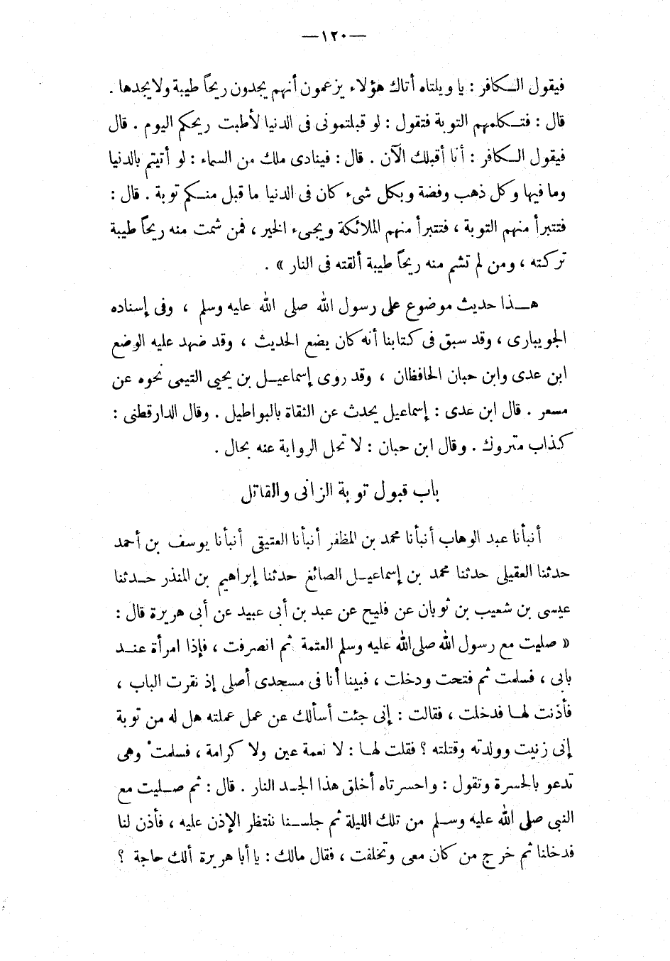 بَاب قبُول تَوْبَة الزانى وَالْقَاتِل أَنْبَأَنَا عَبْدُ الْوَهَّابِ أَنْبَأَنَا مُحَمَّدُ بْنُ الْمُظَفَّرِ أَنْبَأَنَا الْعَتَيقِيُّ أَنْبَأَنَا يُوسُفُ بْنُ أَحْمَدَ حَدَّثَنَا الْعُقَيْلِيُّ حَدَّثَنَا مُحَمَّدُ بْنُ إِسْمَاعِيلَ الصَّائِغُ حَدَّثَنَا إِبْرَاهِيمُ بْنُ الْمُنْذِرِ حَدَّثَنَا عِيسَى بْنُ شُعَيْبِ بْنِ ثَوْبَانَ عَنْ فُلَيْحٍ عَنْ عَبْدِ بْنِ أَبِي عُبَيْدٍ عَنْ أَبِي هُرَيْرَةَ قَالَ: " صَلَّيْتُ مَعَ رَسُولِ اللَّهِ صَلَّى اللَّهُ عَلَيْهِ وَسَلَّمَ الْعَتْمَةَ ثُمَّ انْصَرَفْتُ، فَإِذَا امْرَأَةٌ عِنْدَ بَابِي، فَسَلَّمْتُ ثُمَّ فَتَحْتُ وَدَخَلْتُ، فَبَيْنَا أَنَا فِي مَسْجِدِي أُصَلِّي إِذْ نَقَرَتِ الْبَابَ، فَأَذِنْتُ لَهَا فَدَخَلَتْ، فَقَالَتْ: إِنِّي جِئْتُ أَسْأَلُكَ عَنْ عَمَلٍ عَمِلْتُهُ هَلْ لَهُ مِنْ تَوْبَةٍ إِنِّي زَنَيْتُ وَوَلَدْتُهُ وقتلته؟ فَقلت لَهَا: لانعمة عَيْنٍ وَلا كَرَامَةَ، فَسَلَّمَتْ وَهِيَ تَدْعُو بِالْحَسْرَةِ وَتَقُولُ: وَاحَسْرَتَاهُ أَخلق هَذَا الْجَسَدَ النَّارَ.