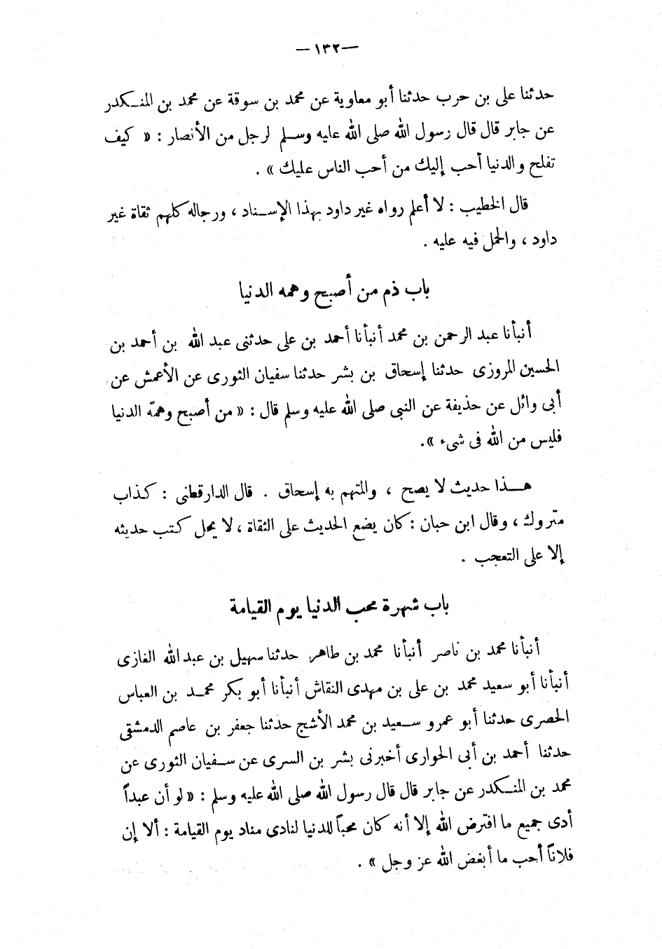 بَاب شهرة محب الدُّنْيَا يَوْم الْقِيَامَة أَنْبَأَنَا مُحَمَّدُ بْنُ نَاصِرٍ أَنْبَأَنَا مُحَمَّدُ بْنُ طَاهِر حَدثنَا سُهَيْل بن عبد الله الْغَازِيُّ أَنْبَأَنَا أَبُو سَعِيدٍ مُحَمَّدُ بْنُ عَلِيِّ بْنِ مَهْدِي النَّقَّاشُ أَنبأَنَا أَبُو بكر مُحَمَّد بن الْعَبَّاسِ الْحُصَرِيُّ حَدَّثَنَا أَبُو عَمْرٍو سَعِيدُ بْنُ مُحَمَّدٍ الأَشَجُّ حَدَّثَنَا جَعْفَرُ بْنُ عَاصِمٍ الدِّمَشْقِيُّ حَدَّثَنَا أَحْمَدُ بْنُ أَبِي الْحَوَارِيُّ أَخْبَرَنِي بِشْرُ بْنُ السُّرِّيِّ عَنْ سُفْيَانَ الثَّوْرِيُّ عَنْ مُحَمَّدِ بْنِ الْمُنْكَدِرِ عَنْ جَابِرٍ قَالَ قَالَ رَسُولُ الله صَلَّى اللَّهُ عَلَيْهِ وَسَلَّمَ: " لَوْ أَنَّ عَبْدًا أَدَّى جَمِيعَ مَا افْتَرَضَ اللَّهُ إِلا أَنَّهُ كَانَ مُحِبًّا لِلدُّنْيَا لَنَادَى مُنَادٍ يَوْمَ الْقِيَامَةِ: أَلا إِنَّ فُلانًا أحب مَا أبْغض الله عزوجل ".