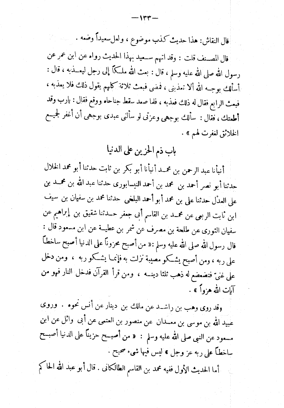 بَاب ذمّ الحزين على الدُّنْيَا أَنبأَنَا عبد الرحمن بْنُ مُحَمَّدٍ أَنْبَأَنَا أَبُو بَكْرٍ بْنُ ثَابِتٍ حَدَّثَنَا أَبُو مُحَمَّدٍ الْخَلالُ حَدَّثَنَا أَبُو نَصْرٍ أَحْمَدُ بْنُ مُحَمَّدِ بْنِ أَحْمَدَ النَّيْسَابُورِيُّ حَدثنَا عبد الله بْنُ مُحَمَّدِ بْنِ عَلِيٍّ الْعَدْلُ حَدَّثَنَا عَلِيُّ بْنُ مُحَمَّدٍ أَبُو أَحْمَدَ الْبَلْخِيُّ حَدَّثَنَا مُحَمَّدُ بْنُ سُفْيَان بن سيف ابْن ثَابِتٍ الرِّبْعِيُّ عَنْ مُحَمَّدِ بْنِ الْقَاسِمِ أَبِي جَعْفَرٍ حَدَّثَنَا شَقِيقُ بْنُ إِبْرَاهِيمَ عَنْ سُفْيَانَ الثَّوْرِيِّ عَنْ طَلْحَةَ بْنِ مُصَرِّفٍ عَنْ شَمَرِ بْنِ عَطِيَّةَ عَنِ ابْنِ مَسْعُودٍ قَالَ: