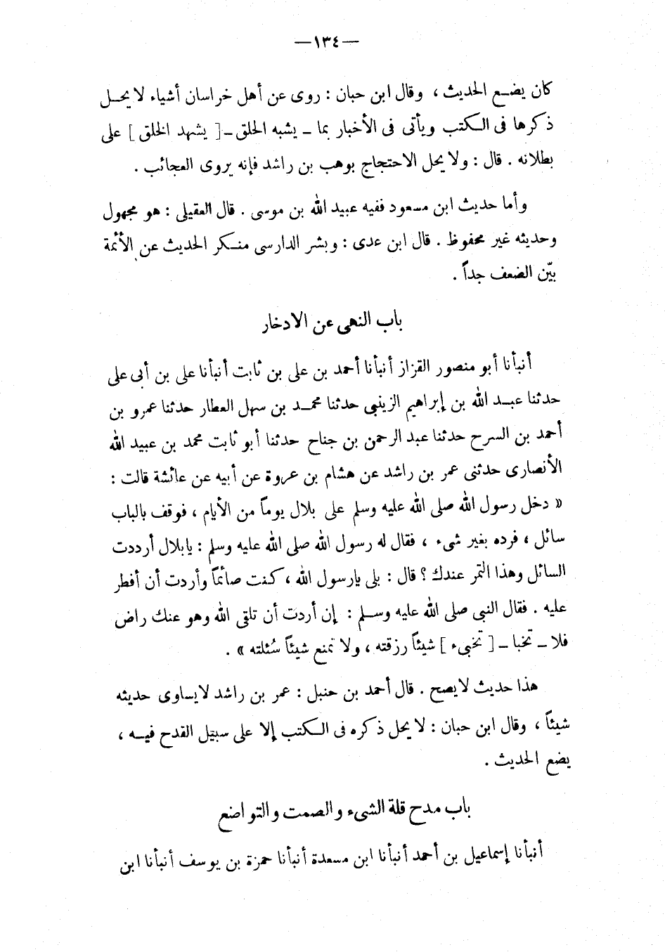بَاب النهى عَن الادخار أَنْبَأَنَا أَبُو مَنْصُورٍ الْقَزَّازُ أَنْبَأَنَا أَحْمد بن عَليّ بن ثَابت أَنْبَأَنَا عَلِيُّ بْنُ أَبِي عَلِيٍّ حَدثنَا عبد الله بْنُ إِبْرَاهِيمَ الزَّيْنَبِيُّ حَدَّثَنَا مُحَمَّدُ بْنُ سَهْلٍ الْعَطَّارُ حَدَّثَنَا عَمْرُو بْنُ أَحْمَدَ بْنِ السَّرْحِ حَدَّثَنَا عبد الرحمن بْنُ جَنَاحٍ حَدَّثَنَا أَبُو ثَابِتٍ مُحَمَّد بن عبيد الله الأَنْصَارِيُّ حَدَّثَنِي عُمَرُ بْنُ رَاشِدٍ عَنْ هِشَامِ بْنِ عُرْوَةَ عَنْ أَبِيهِ عَنْ عَائِشَةَ قَالَتْ: " دَخَلَ رَسُول الله صَلَّى اللَّهُ عَلَيْهِ وَسَلَّمَ عَلَى بِلالٍ يَوْمًا مِنَ الأَيَّامِ، فَوَقَفَ بِالْبَابِ