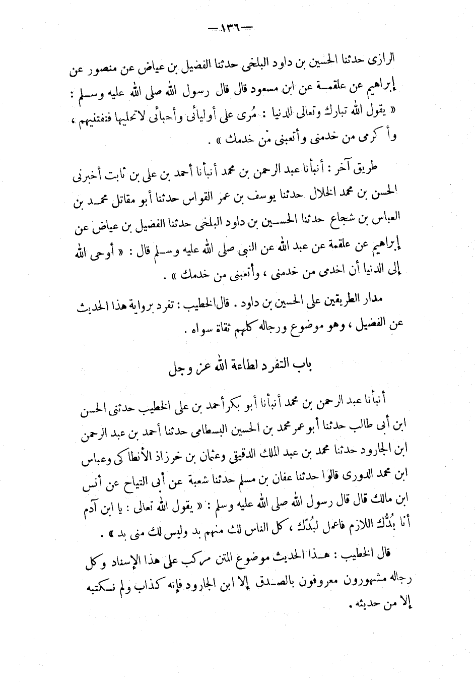 طَرِيق آخر: أَنْبَأَنَا عبد الرحمن بْنُ مُحَمَّدٍ أَنْبَأَنَا أَحْمَدُ بْنُ عَلِيِّ بْنِ ثَابِتٍ أَخْبَرَنِي الْحَسَنُ بْنُ مُحَمَّدٍ الْخَلالُ حَدَّثَنَا يُوسُفُ بْنُ عُمَرَ الْقَوَّاسُ حَدَّثَنَا أَبُو مَقَاتِلٍ مُحَمَّدُ بْنُ الْعَبَّاسِ بْنِ شُجَاعٍ حَدَّثَنَا الْحُسَيْنُ بْنُ دَاوُدَ الْبَلْخِيُّ حَدَّثَنَا الْفُضَيْلُ بْنُ عِيَاضٍ عَنْ إِبْرَاهِيمَ عَنْ عَلْقَمَةَ عَنْ عبد الله عَن النَّبِي صَلَّى اللَّهُ عَلَيْهِ وَسَلَّمَ قَالَ: " أَوْحَى اللَّهُ إِلَى الدُّنْيَا أَنْ أَخْدِمِي مَنْ خَدَمَنِي، وأتعبني مَنْ خَدَمَكِ ".