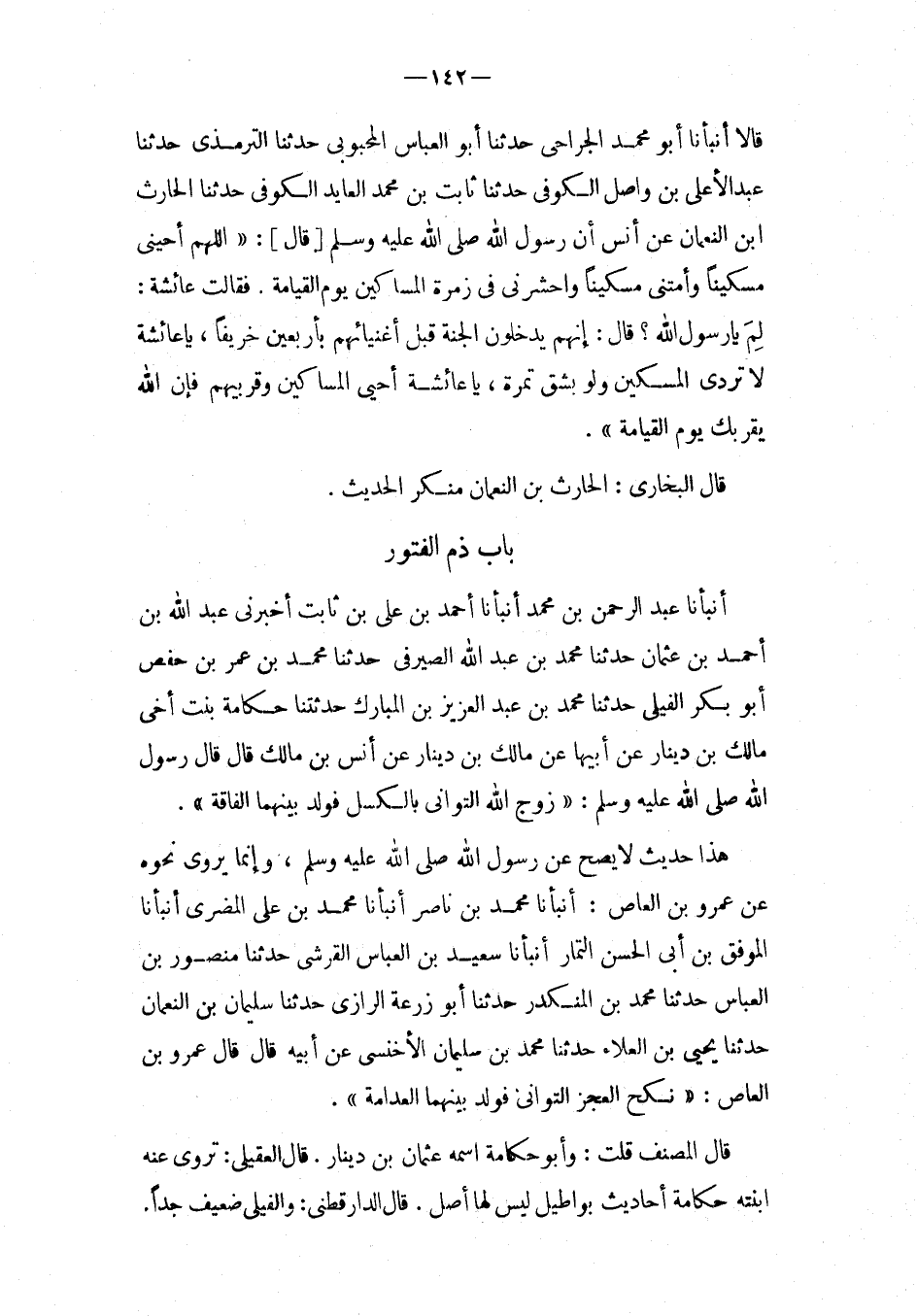 قَالا أَنْبَأَنَا أَبُو مُحَمَّدٍ الْجَرَّاحِيُّ حَدَّثَنَا أَبُو الْعَبَّاسِ الْمَحْبُوبِيُّ حَدَّثَنَا التِّرْمِذِيّ حَدثنَا عبد الاعلى بْنُ وَاصَلٍ الْكُوفِيُّ حَدَّثَنَا ثَابِتُ بْنُ مُحَمَّدٍ الْعَايِدُ الْكُوفِيُّ حَدَّثَنَا الْحَارِث ابْن النُّعْمَانِ عَنْ أَنَسٍ أَنَّ رَسُولَ الله صَلَّى اللَّهُ عَلَيْهِ وَسَلَّمَ [قَالَ] : " اللَّهُمَّ أَحْيِنِي مِسْكِينًا وَأَمِتْنِي مِسْكِينًا وَاحْشُرْنِي فِي زُمْرَةِ الْمَسَاكِينِ يَوْمَ الْقِيَامَةِ.