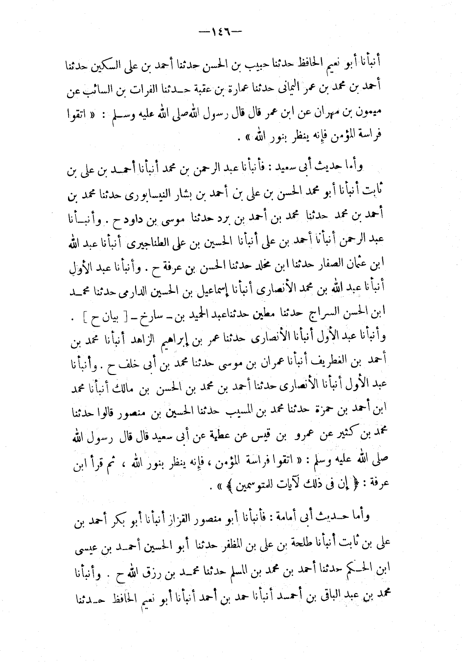 أَنْبَأَنَا أَبُو نُعَيْمٍ الْحَافِظُ حَدَّثَنَا حَبِيبُ بْنُ الْحَسَنِ حَدَّثَنَا أَحْمَدُ بْنُ عَلِيٍّ السَّكِينِ حَدَّثَنَا أَحْمَدُ بن مُحَمَّد بن عمر الْيَمَانِيّ حَدَّثَنَا عُمَارَةُ بْنُ عُقْبَةَ حَدَّثَنَا الْفُرَاتِ بْنِ السَّائِبِ عَنْ مَيْمُونِ بْنِ مِهْرَانَ عَنِ ابْنِ عُمَرَ قَالَ قَالَ رَسُول الله صَلَّى اللَّهُ عَلَيْهِ وَسَلَّمَ: " اتَّقُوا فِرَاسَةَ الْمُؤْمِنِ فَإِنَّهُ يَنْظُرُ بِنُورِ اللَّهِ ".