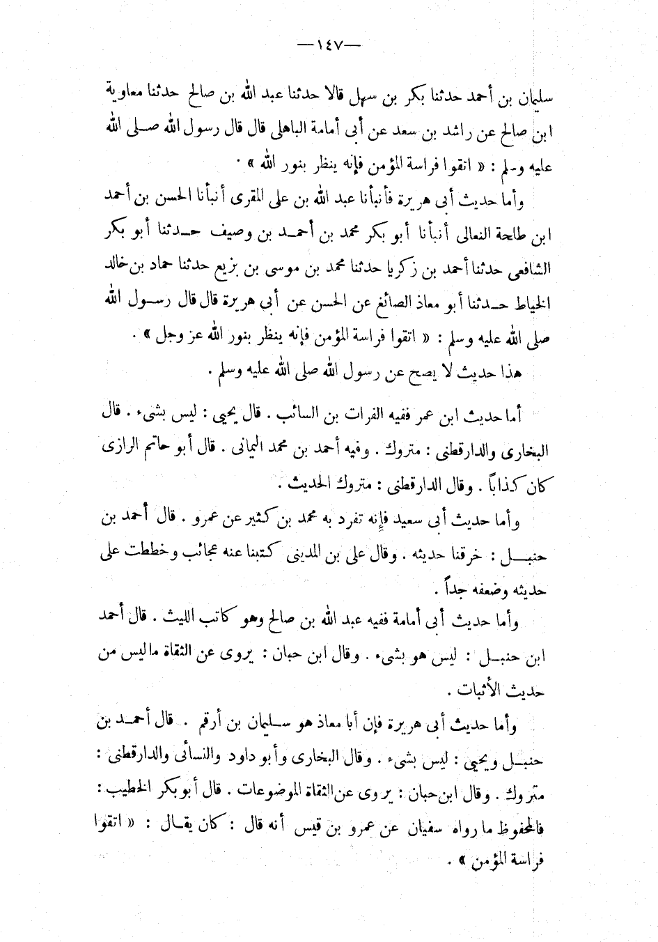 ابْن طَلْحَةَ النِّعَالِيُّ أَنْبَأَنَا أَبُو بَكْرٍ مُحَمَّدُ بْنُ أَحْمَدَ بْنِ وَصِيفٍ حَدَّثَنَا أَبُو بَكْرٍ الشَّافِعِيُّ حَدَّثَنَا أَحْمَدُ بْنُ زَكَرِيَّا حَدَّثَنَا مُحَمَّدُ بْنُ مُوسَى بْنِ بَزِيعٍ حَدَّثَنَا حَمَّادُ بْنُ خَالِدٍ الْخَيَّاطُ حَدَّثَنَا أَبُو مُعَاذٍ الصَّائِغُ عَنِ الْحَسَنِ عَنْ أَبِي هُرَيْرَةَ قَالَ قَالَ رَسُول الله صَلَّى اللَّهُ عَلَيْهِ وَسَلَّمَ: " اتَّقُوا فِرَاسَةَ الْمُؤْمِنِ فَإِنَّهُ ينظر بِنور الله عزوجل ".