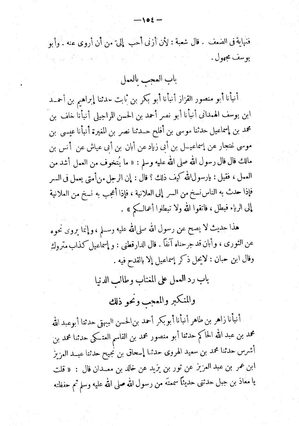 بَاب الْعجب بِالْعَمَلِ أَنْبَأَنَا أَبُو مَنْصُورٍ الْقَزَّازُ أَنْبَأَنَا أَبُو بَكْرِ بْنُ ثَابِتٍ حَدَّثَنَا إِبْرَاهِيم بن أَحْمد ابْن يُوسُفَ الْهَمْدَانِيُّ أَنْبَأَنَا أَبُو نَصْرٍ أَحْمَدُ بْنُ الْحَسَنِ الْمَرَاجِيلِيُّ أَنْبَأَنَا خَلَفُ بْنُ مُحَمَّدِ بْنِ إِسْمَاعِيلَ حَدَّثَنَا مُوسَى بْنُ أَفْلَحَ حَدَّثَنَا نَصْرُ بْنُ الْمُغِيرَةِ أَنْبَأَنَا عِيسَى بْنُ مُوسَى غُنْجَارٌ عَنْ إِسْمَاعِيلَ بْنِ أَبِي زِيَادٍ عَنْ أَبَانِ بْنِ أَبِي عَيَّاشٍ عَنْ أَنَسِ بْنِ مَالِكٍ قَالَ قَالَ رَسُولُ الله صَلَّى اللَّهُ عَلَيْهِ وَسَلَّمَ: " مَا يُتَخَوَّفُ مِنَ الْعَمَلِ أَشَدّ مِنَ الْعَمَلِ، فَقِيلَ: يَا رَسُولَ اللَّهِ كَيْفَ ذَلِكَ؟ قَالَ: إِنَّ الرَّجُلَ مِنْ أُمَّتِي يَعْمَلُ فِي السِّرِّ فَإِذَا حَدَّثَ بِهِ النَّاسُ نَسَخَ مِنَ السِّرِ إِلَى الْعَلانِيَةِ، فَإِذَا أُعْجِبَ بِهِ نَسَخَ مِنَ الْعَلانِيَةِ إِلَى الرِّيَاءِ فَبَطَلَ، فَاتَّقُوا اللَّهَ وَلا تَبْطِلُوا أَعْمَالَكُمْ ".
