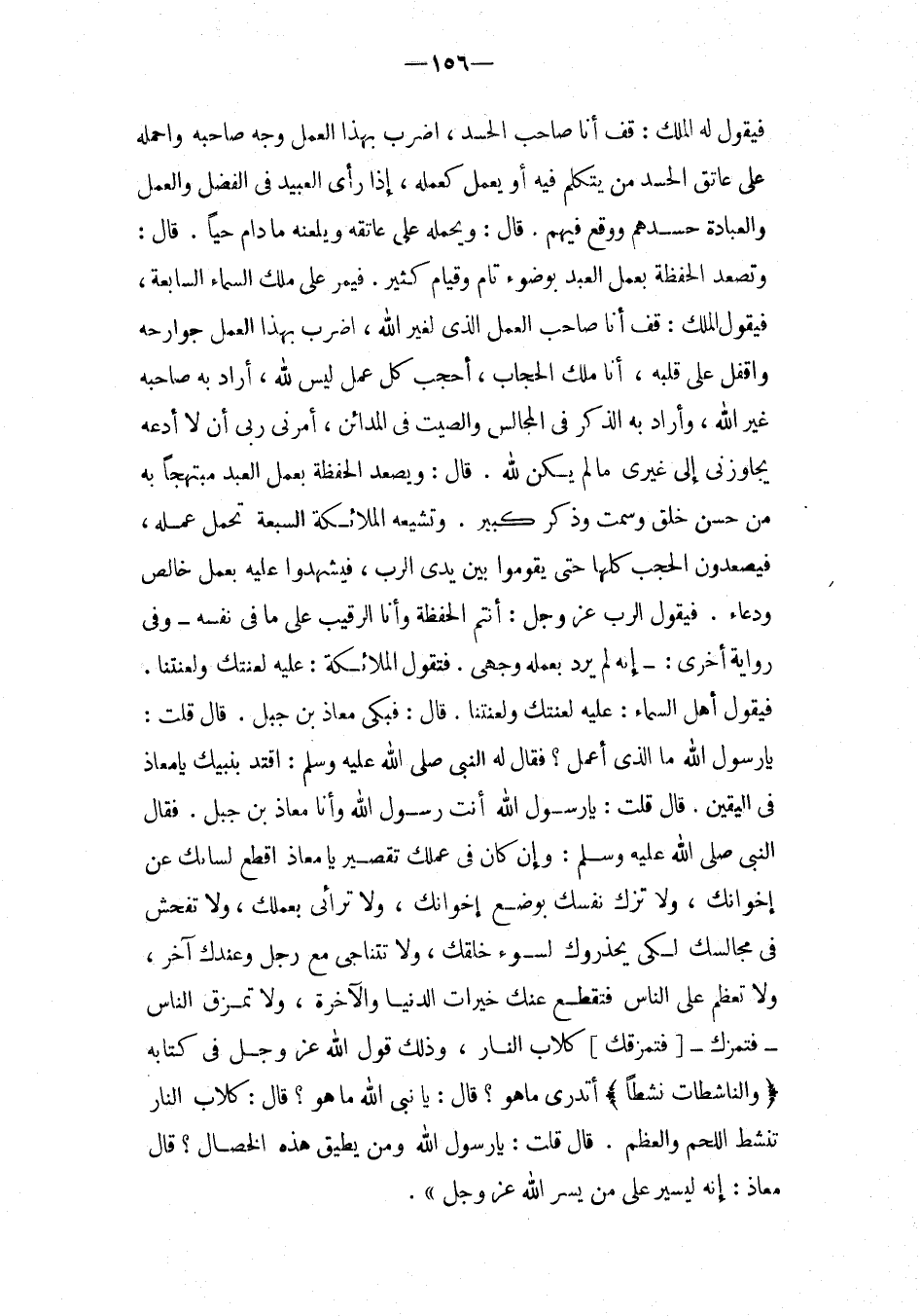 فَيَقُولُ لَهُ الْمَلكُ: قِفْ أَنَا صَاحِبُ الْحَسَدِ، اضْرِبْ بِهَذَا الْعَمَلِ وَجْهَ صَاحِبِهِ وَاحْمِلْهُ عَلَى عَاتِقِ الْحَسَدِ مَنْ يَتَكَلَّمَ فِيهِ أَوْ يَعَمْلُ كَعَمَلَه، إِذَا رَأَى الْعَبِيدِ فِي الْفَضْلِ وَالْعَمَلِ وَالْعِبَادَةِ حَسَدَهُمْ وَوَقع فيهم.