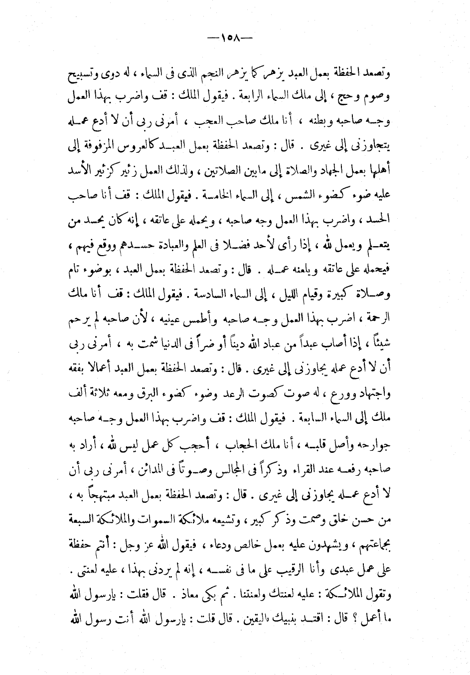 قَالَ: وَتَصْعَدُ الْحَفْظَةَ بِعَمَلِ الْعَبْدِ كَالْعَرُوسِ الْمَزْفُوفَةِ إِلَى أَهْلِهَا بِعَمَلِ الْجِهَادِ وَالصَّلاةِ إِلَى مَا بَيْنَ الصَّلاتَيْنِ، وَلِذَلِكَ الْعَمَلُ زَئِيرٌ كَزَئِيرِ الأَسَدِ عَلَيْهِ ضَوْءٌ كَضَوْءِ الشَّمْسِ، إِلَى السَّمَاءِ الْخَامِسَةِ.