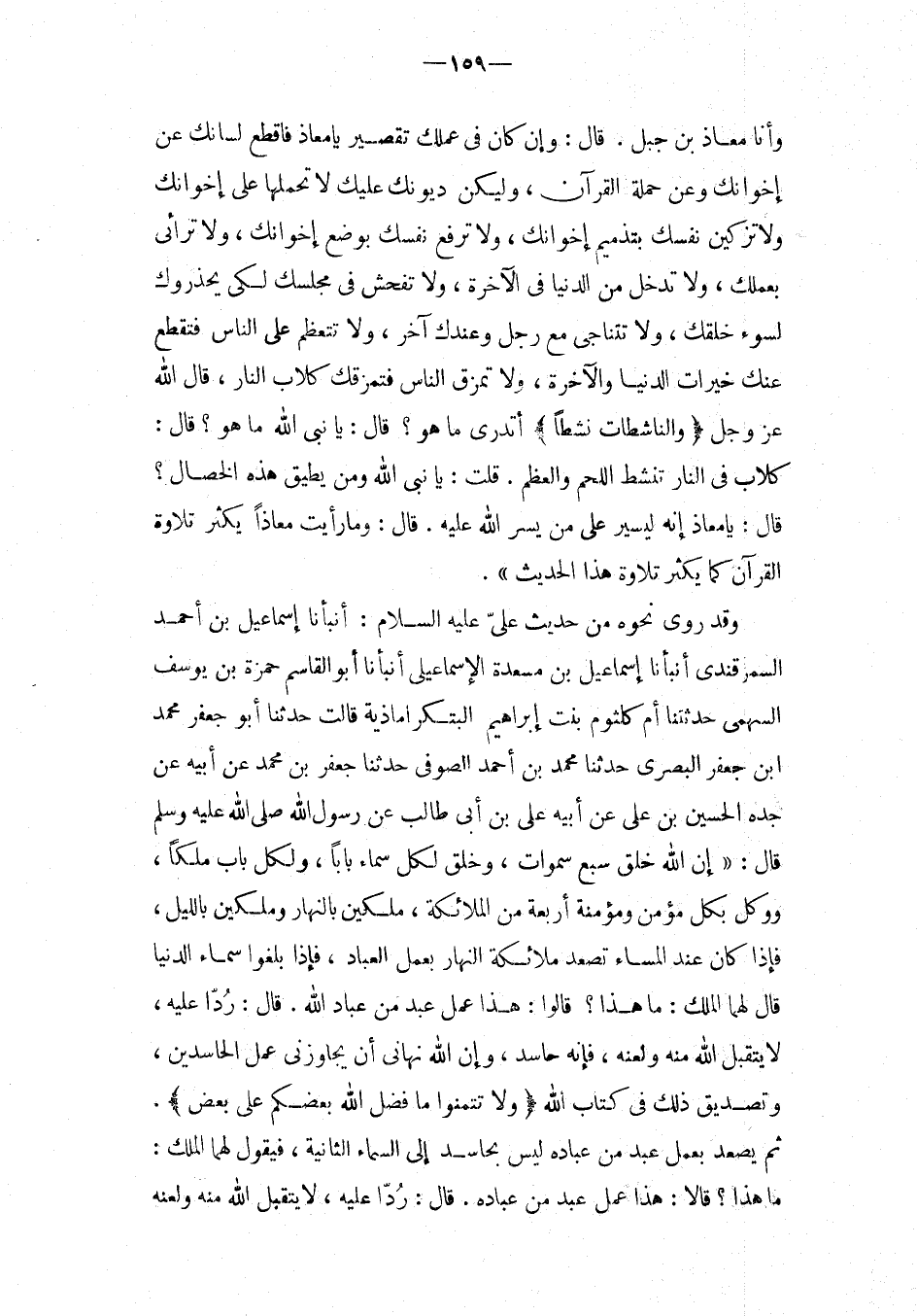 وَقَدْ رَوَى نَحوه من حَدِيث عَلَى عَلَيْهِ السَّلام: أَنْبَأَنَا إِسْمَاعِيلُ بْنُ أَحْمَدَ السَّمَرْقَنْدِيُّ أَنْبَأَنَا إِسْمَاعِيلُ بْنُ مَسْعَدَةَ الإِسْمَاعِيلِيُّ أَنْبَأَنَا أَبُو الْقَاسِمِ حَمْزَةُ بْنُ يُوسُفَ السَّهْمِيُّ حَدَّثَتْنَا أُمُّ كُلْثُومِ بِنْتُ إِبْرَاهِيم البتكرا ماذية قَالَتْ حَدَّثَنَا أَبُو جَعْفَرٍ مُحَمَّدُ ابْن جَعْفَرٍ الْبَصْرِيُّ حَدَّثَنَا مُحَمَّدُ بْنُ أَحْمَدَ الصُّوفِيُّ حَدَّثَنَا جَعْفَرُ بْنُ مُحَمَّدٍ عَنْ أَبِيهِ عَنْ جَدِّهِ الْحُسَيْنِ بْنِ عَلِيٍّ عَنْ أَبِيهِ عَلِيِّ بْنِ أَبِي طَالِبٍ عَنْ رَسُول الله صَلَّى اللَّهُ عَلَيْهِ وَسَلَّمَ قَالَ: " إِنَّ اللَّهَ خَلَقَ سَبْعَ سَمَواتٍ، وَخَلَقَ لِكُلِّ سَمَاءٍ بَابًا، وَلِكُلِّ بَابٍ مَلَكًا، وَوَكَّلَ بِكُلِّ مُؤْمِنٍ وَمُؤْمِنَةٍ أَرْبَعَةً مِنَ الْمَلائِكَةِ، مَلَكَيْنِ بِالنَّهَارِ وَمَلَكَيْنِ بِاللَّيْلِ، فَإِذَا كَانَ عِنْدَ الْمَسَاءَ تَصْعَدُ مَلائِكَةُ النَّهَارِ بِعَمَلِ الْعِبَادِ، فَإِذَا بَلَغُوا سَمَاءَ الدُّنْيَا قَالَ لَهُمَا الْمَلَكُ: مَا هَذَا؟ قَالُوا: هَذَا عَمَلُ عَبْدٍ مِنْ عِبَادِ اللَّهِ.