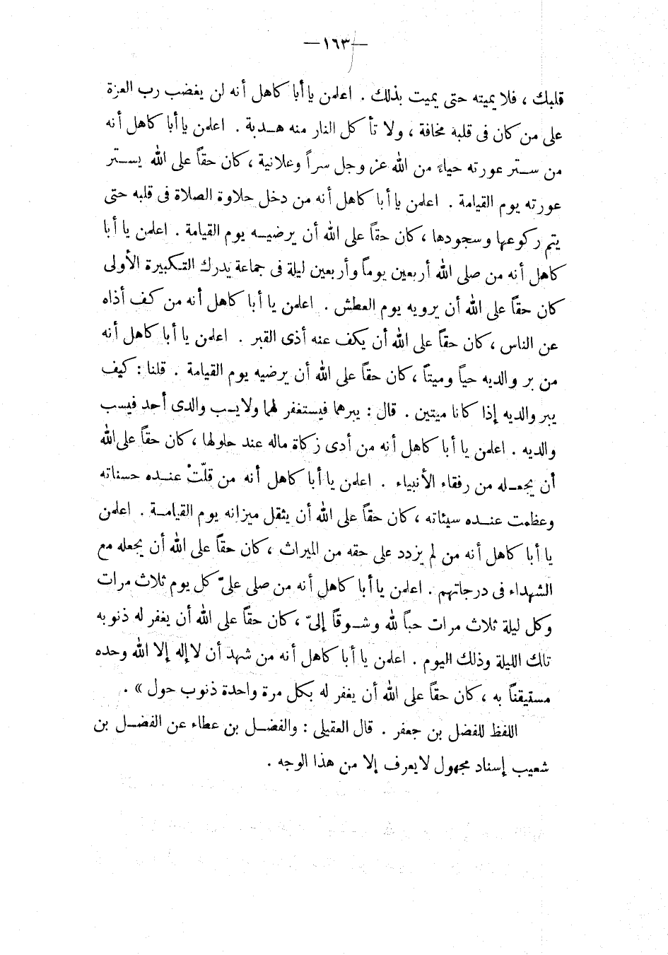 اعْلَمَنَّ يَا أَبَا كَاهِلٍ أَنَّهُ مَنْ شَهِدَ أَنْ لَا إِلَهَ إِلا اللَّهُ وَحْدَهُ مُسْتَيْقِنًا بِهِ، كَانَ حَقًّا عَلَى اللَّهِ أَنْ يَغْفِرَ لَهُ بِكُلِّ مَرَّةٍ وَاحِدَةٍ ذُنُوبَ حَوْلٍ ".