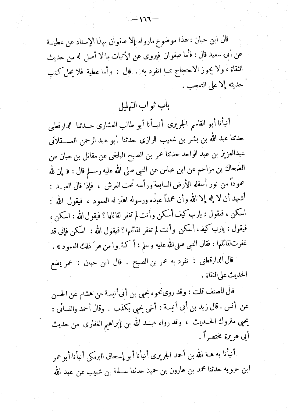بَاب ثَوَاب التهليل أَنْبَأَنَا أَبُو الْقَاسِمِ الْجُرَيْرِيُّ أَنْبَأَنَا أَبُو طَالب العشارى حَدثنَا الدَّارقطني حَدثنَا عبد الله بْنُ بِشْرِ بْنِ شُعَيْبٍ الرَّازِيُّ حَدَّثَنَا أَبُو عَبْدِ الرَّحْمَنِ الْعَسْقَلانِيُّ عَبْدُ الْعَزِيزِ بْنُ عَبْدِ الْوَاحِدِ حَدَّثَنَا عُمَرُ بْنُ الصُّبْحِ الْبَلْخِيُّ عَنْ مُقَاتِلِ بْنِ حِبَّانَ عَنِ الضَّحَاكِ بْنِ مُزَاحِمٍ عَنِ ابْنِ عَبَّاسٍ عَنِ النَّبِيِّ صَلَّى اللَّهُ عَلَيْهِ وَسَلَّمَ قَالَ: " إِنَّ لِلَّهِ عَمُودًا مِنْ نُورٍ أَسْفَلُهُ الأَرْضُ السَّابِعَةُ وَرَأْسُهُ تَحْتَ الْعَرْشِ، فَإِذَا قَالَ الْعَبْدُ: أَشْهَدُ أَنْ لَا إِلَه إِلَّا الله وَأَن مُحَمَّدًا عَبْدُهُ وَرَسُولُهُ اهْتَزَّ لَهُ الْعَمُودُ، فَيَقُولُ اللَّهُ: اسْكُنْ، فَيَقُولُ: يَا رَبُّ كَيْفَ أَسْكُنُ وَأَنْتَ لَمْ تَغْفِرْ لِقَائِلِهَا؟ فَيَقُولُ اللَّهُ: اسْكُنْ، فَيَقُولُ: يَا رَبُّ كَيْفَ أَسْكُنُ وَأَنْتَ لَمْ تَغْفِرْ لِقَائِلِهَا؟ فَيَقُولُ اللَّهُ: اسْكُنْ فَإِنِّي قَدْ غَفَرْتُ لِقَائِلِهَا، فَقَالَ النَّبِيُّ صَلَّى اللَّهُ عَلَيْهِ وَسَلَّمَ: أَكْثِرُوا مِنْ هَزِّ ذَلِك العمود ".