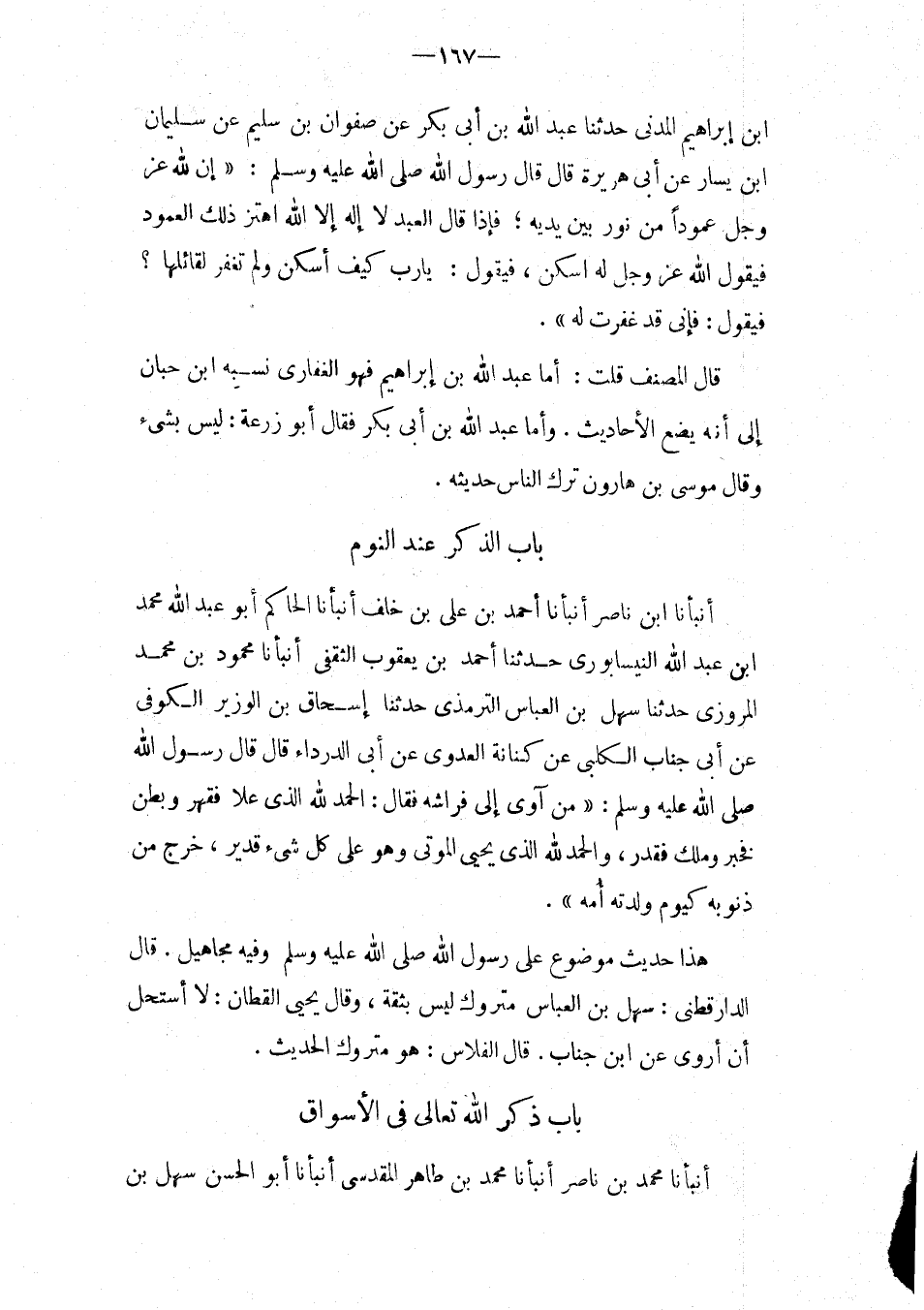 بَاب الذّكر عِنْد النّوم أَنبأَنَا ابْنُ نَاصِرٍ أَنْبَأَنَا أَحْمَدُ بْنُ عَلِيِّ بْنِ خَلَفٍ أَنْبَأَنَا الْحَاكِمُ أَبُو عبد الله مُحَمَّد ابْن عبد الله النَّيْسَابُورِيُّ حَدَّثَنَا أَحْمَدُ بْنُ يَعْقُوبَ الثَّقَفِيُّ أَنْبَأَنَا مَحْمُودُ بْنُ مُحَمَّدٍ الْمَرْوَزِيُّ حَدَّثَنَا سَهْلُ بْنُ الْعَبَّاسِ التِّرْمِذِيُّ حَدَّثَنَا إِسْحَاقُ بْنُ الْوَزِيرِ الْكُوفِيُّ عَنْ أَبِي جَنَابٍ الْكَلْبِيِّ عَنْ كِنَانَةَ الْعَدَوِيِّ عَنْ أَبِي الدَّرْدَاءِ قَالَ قَالَ رَسُولُ اللَّهِ صَلَّى اللَّهُ عَلَيْهِ وَسَلَّمَ: " من آوَى إِلَى فِرَاشِهِ فَقَالَ: الْحَمْدُ لِلَّهِ الَّذِي عَلا فَقَهَرَ وَبَطنَ فَخَبَرَ وَمَلَكَ فَقَدِرَ، وَالْحَمْدُ لِلَّهِ الَّذِي يُحْيِي الْمَوْتَى وَهُوَ عَلَى كل شئ قَدِيرٍ، خَرَجَ مِنْ ذُنُوبِهِ كَيَوْمِ وَلَدَتْهُ أُمُّهُ ".