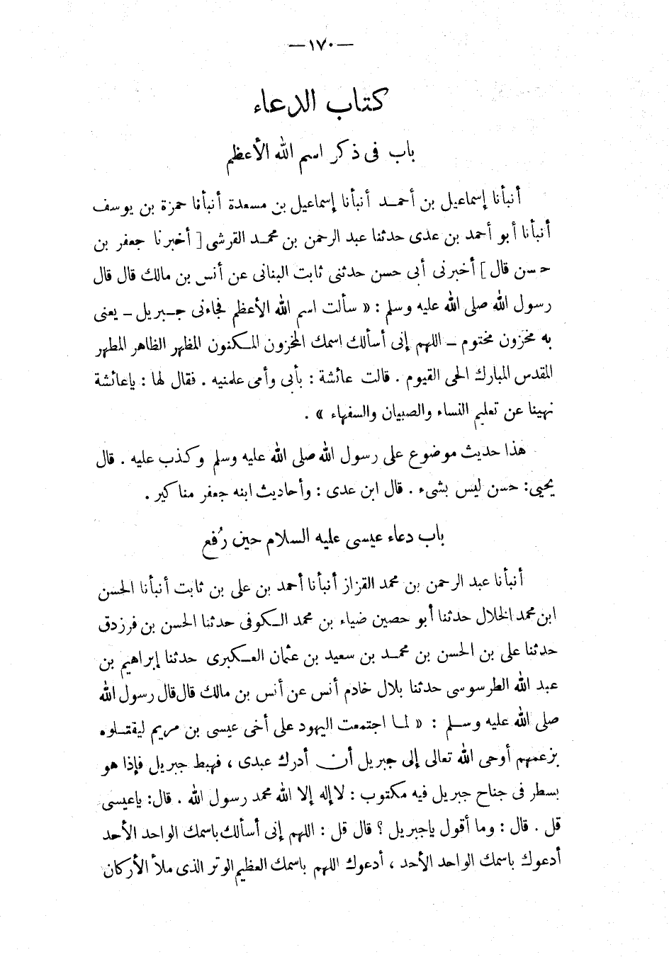 بَاب فِي ذكر اسْم الله الاعظم أَنبأَنَا إِسْمَاعِيل بن أَحْمد أَنبأَنَا إِسْمَاعِيلُ بْنُ مَسْعَدَةَ أَنْبَأَنَا حَمْزَةُ بْنُ يُوسُفَ أَنْبَأَنَا أَبُو أَحْمَدَ بن عدى حَدثنَا عبد الرحمن بْنُ مُحَمَّدٍ الْقُرَشِيُّ [أَخْبَرَنَا جَعْفَرُ بْنُ حَسَنٍ قَالَ] أَخْبَرَنِي أَبِي حَسَنٍ حَدَّثَنِي ثَابِتٌ الْبُنَانِيُّ عَنْ أَنَسِ بْنِ مَالِكٍ قَالَ قَالَ رَسُول الله صَلَّى اللَّهُ عَلَيْهِ وَسَلَّمَ: " سَأَلْتُ اسْمَ اللَّهِ الأَعْظَمَ فَجَاءَنِي جِبْرِيلُ - يَعْنِي بِهِ مَخْزُون مَخْتُوم - اللَّهُمَّ إِنِّي أَسْأَلُكَ اسْمَكَ الْمَخْزُونَ الْمَكْنُونَ الْمُظْهِرَ الظَّاهِرَ الْمُطَهِّرَ الْمُقَدِّسَ الْمُبَارَكَ الْحَيِّ الْقَيُّومَ.