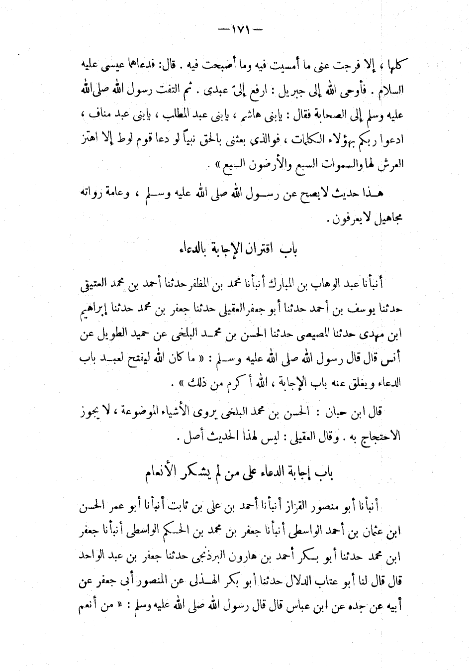 بَاب إِجَابَة الدُّعَاء عَلَى من لَمْ يشْكر الانعام أَنْبَأَنَا أَبُو مَنْصُورٍ الْقَزَّازُ أَنْبَأَنَا أَحْمد بن عَليّ بن ثَابت أَنبأَنَا أَبُو عمر الْحسن ابْن عُثْمَانَ بْنِ أَحْمَدَ الْوَاسِطِيُّ أَنْبَأَنَا جَعْفَرُ بْنُ مُحَمَّدِ بْنِ الْحَكَمِ الوَاسِطِيّ أَنبأَنَا جَعْفَر ابْن مُحَمَّدٍ حَدَّثَنَا أَبُو بَكْرٍ أَحْمَدُ بْنُ هَارُونَ الْبَرْذَنْجِيُّ حَدَّثَنَا جَعْفَرُ بْنُ عَبْدِ الْوَاحِدِ