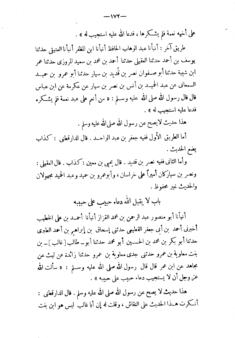 طَرِيق آخر: أَنْبَأَنَا عَبْدُ الْوَهَّابِ الْحَافِظُ أَنْبَأَنَا ابْنُ الْمُظَفَّرِ أَنْبَأَنَا الْعَتِيقِيُّ حَدَّثَنَا يُوسُفُ بْنُ أَحْمَدَ حَدَّثَنَا الْعَقِيلِيُّ حَدَّثَنَا أَحْمَدُ بْنُ مُحَمَّدِ بْنِ سَعِيدٍ الْمَرْوَزِيُّ حَدَّثَنَا عمر ابْن شَيْبَةَ حَدَّثَنَا أَبُو صَفْوَانَ نَصْرُ بْنُ قَدِيدِ بْنِ سَيَّارٍ حَدَّثَنَا أَبُو عَمْرِو بْنُ حُمَيْدٍ السَّمْعَانِيُّ عَن عبد الحميد بْنِ أَنَسِ بْنِ نَصْرِ بْنِ سَيَّارٍ عَنْ عِكْرِمَةَ عَنِ ابْنِ عَبَّاسٍ قَالَ قَالَ رَسُولُ اللَّهِ صَلَّى اللَّهُ عَلَيْهِ وَسَلَّمَ: " من أَنْعَمَ عَلَى عَبْدٍ نِعْمَةً فَلَمْ يَشْكُرْهُ فَدَعَا عَلَيْهِ اسْتُجِيبَ لَهُ ".