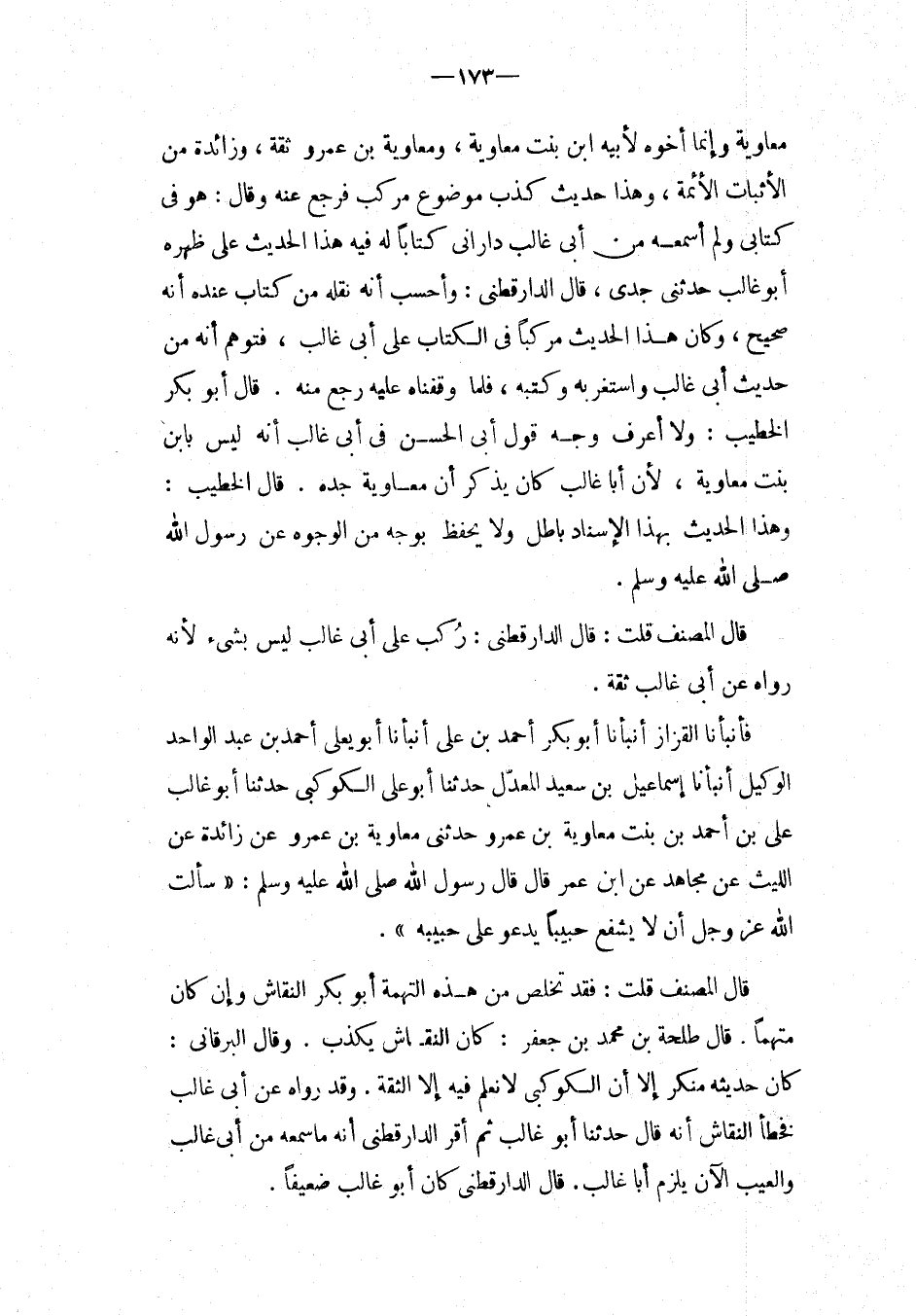 مُعَاوِيَة وَإِنَّمَا أَخُوهُ لِأَبِيهِ ابْن بنت مُعَاوِيَة، ومُعَاوِيَة بْن عَمْرو ثِقَة، وزائدة من الْأَثْبَات الْأَئِمَّة، وَهَذَا حَدِيث كذب مَوْضُوع مركب فَرجع عَنْهُ وَقَالَ: هُوَ فِي كتابي وَلَمْ أسمعهُ من أَبِي غَالب داراني كتابا لَهُ فِيهِ هَذَا الْحَدِيث عَلَى ظَهره أَبُو غَالب حَدَّثَنِي جدى، قَالَ الدَّارقطني: وأحسب أَنَّهُ نَقله من كتاب عِنْده أَنَّهُ صَحِيح، وَكَانَ هَذَا الْحَدِيث مركبا فِي الْكتاب عَلَى أَبِي غَالب، فَتوهم أَنَّهُ من حَدِيث أَبِي غَالب واستغر بِهِ وَكتبه، فَلَمَّا وقفناه عَلَيْهِ رَجَعَ مِنْهُ.