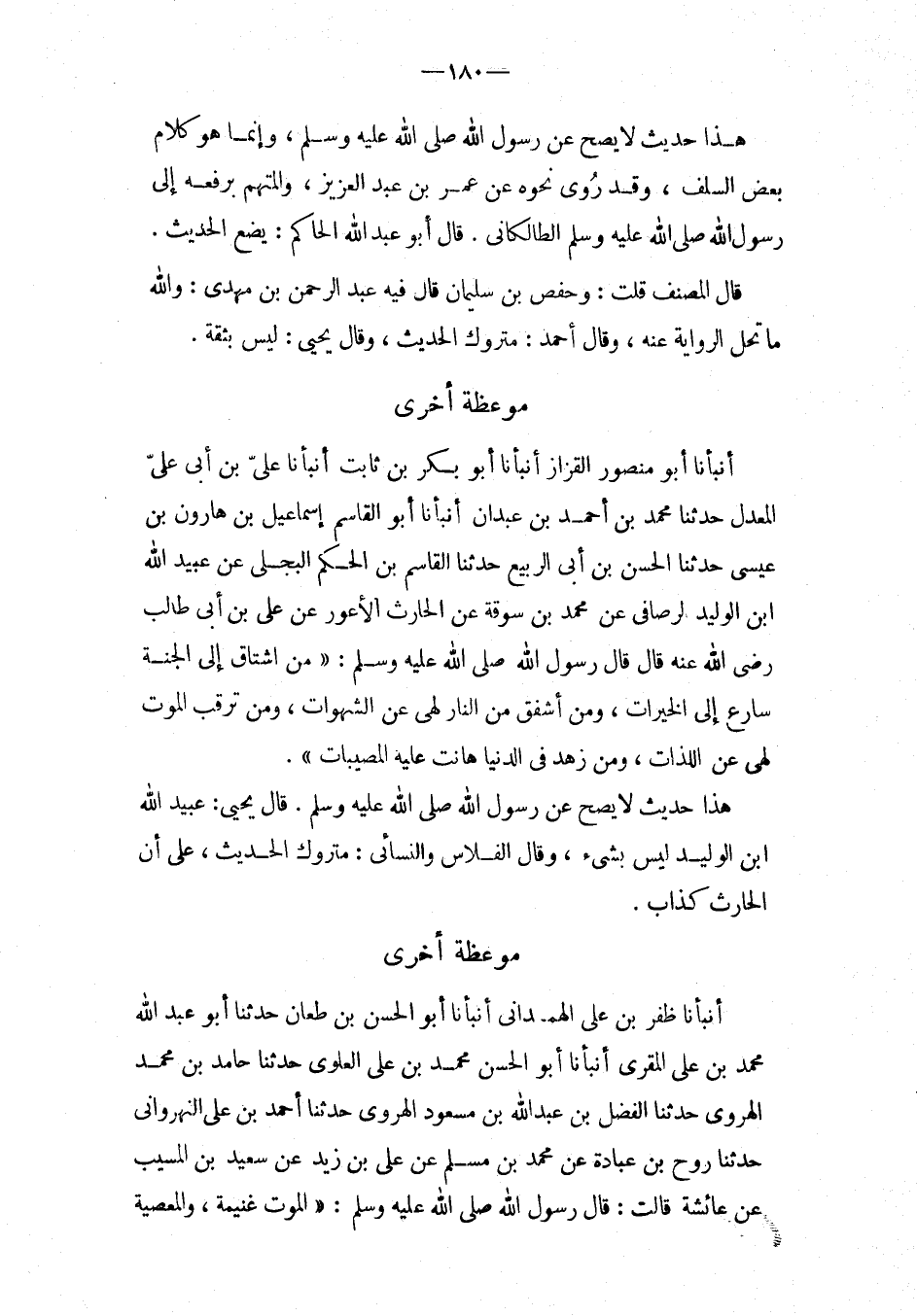 موعظة أُخْرَى أَنْبَأَنَا أَبُو مَنْصُورٍ الْقَزَّازُ أَنْبَأَنَا أَبُو بَكْرِ بْنُ ثَابِتٍ أَنْبَأَنَا عَلِيُّ بْنُ أَبِي عَلِيٍّ الْمُعَدَّلُ حَدَّثَنَا مُحَمَّدُ بْنُ أَحْمَدَ بْنِ عَبْدَانَ أَنْبَأَنَا أَبُو الْقَاسِمِ إِسْمَاعِيلُ بْنُ هَارُونَ بْنِ عِيسَى حَدَّثَنَا الْحَسَنُ بْنُ أَبِي الرَّبِيعِ حَدَّثَنَا الْقَاسِمُ بْنُ الْحَكَمِ الْبَجَلِيُّ عَنْ عبيد الله ابْن الْوَلِيد لرصافي عَنْ مُحَمَّدِ بْنِ سَوْقَةَ عَنْ الْحَارِثِ الأَعْوَرِ عَنْ عَلِيِّ بْنِ أبي طَالب رَضِي الله عَنهُ قَالَ قَالَ رَسُول الله صَلَّى اللَّهُ عَلَيْهِ وَسَلَّمَ: " مَنِ اشْتَاقَ إِلَى الْجَنَّةِ سَارَعَ إِلَى الْخَيْرَاتِ، وَمَنْ أَشْفَقَ مِنَ النَّارِ لَهَى عَنِ الشَّهَوَاتِ، وَمَنْ تَرَقَّبَ الْمَوْتَ لَهَى عَنِ اللَّذَّات، وَمَنْ زَهَدَ فِي الدُّنْيَا هَانَتْ عَلَيْهِ الْمُصَيبَاتُ ".