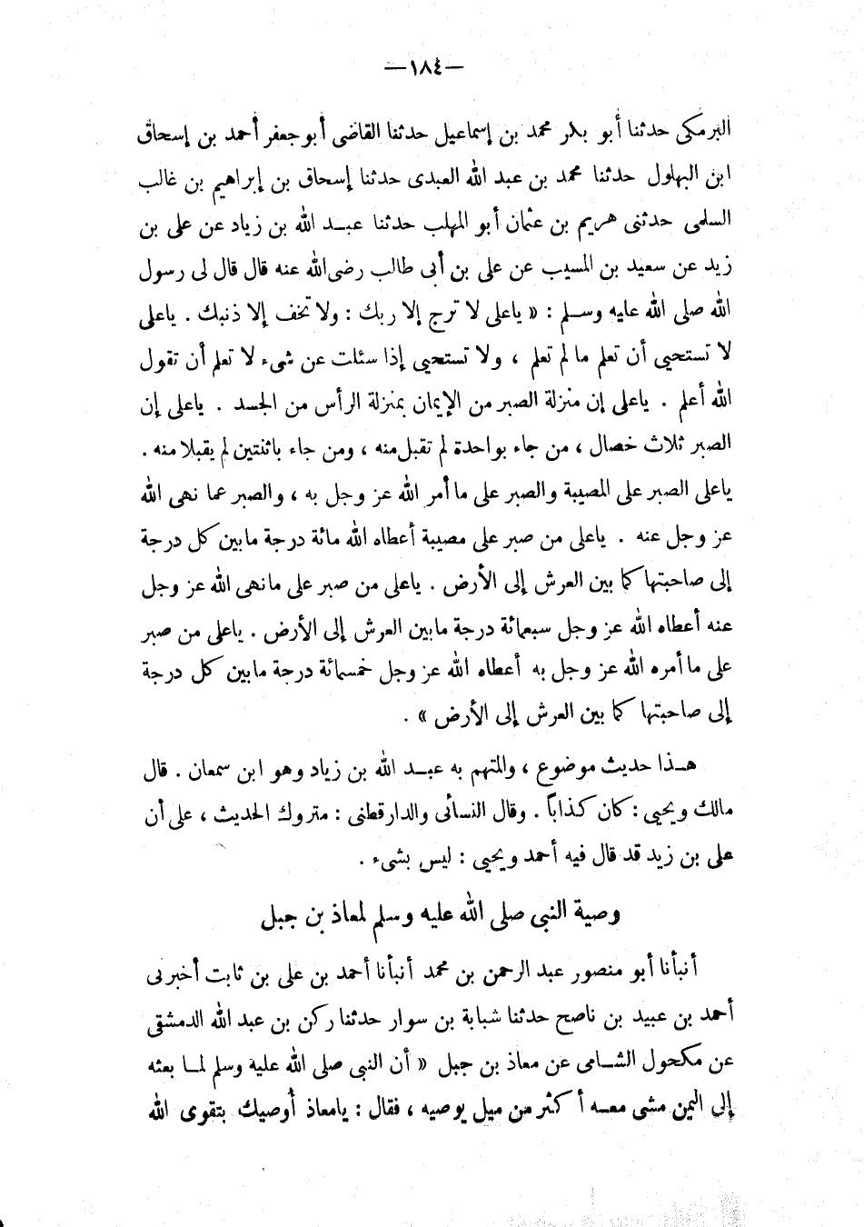 وَصِيَّة النَّبِي صَلَّى اللَّهُ عَلَيْهِ وَسلم لِمعَاذ بن جبل أَنبأَنَا أَبُو مَنْصُور عبد الرحمن بْنُ مُحَمَّدٍ أَنْبَأَنَا أَحْمَدُ بْنُ عَلِيِّ بْنِ ثَابِتٍ أَخْبَرَنِي أَحْمَدُ بْنُ عُبَيْدِ بْنِ نَاصِحٍ حَدَّثَنَا شَبَابَةُ بْنُ سَوَّارٍ حَدَّثَنَا رُكْنُ بن عبد الله الدِّمَشْقِيُّ عَنْ مَكْحُولٍ الشَّامِيِّ عَنْ مُعَاذِ بْنِ جَبَلٍ " أَنَّ النَّبِيَّ صَلَّى اللَّهُ عَلَيْهِ وَسَلَّمَ لما بَعَثَهُ إِلَى الْيَمَنِ مَشَى مَعَهُ أَكْثَرَ مِنْ مِيلٍ يُوصِيهِ، فَقَالَ: يَا مُعَاذُ أُوصِيكَ بِتَقْوَى اللَّهِ
