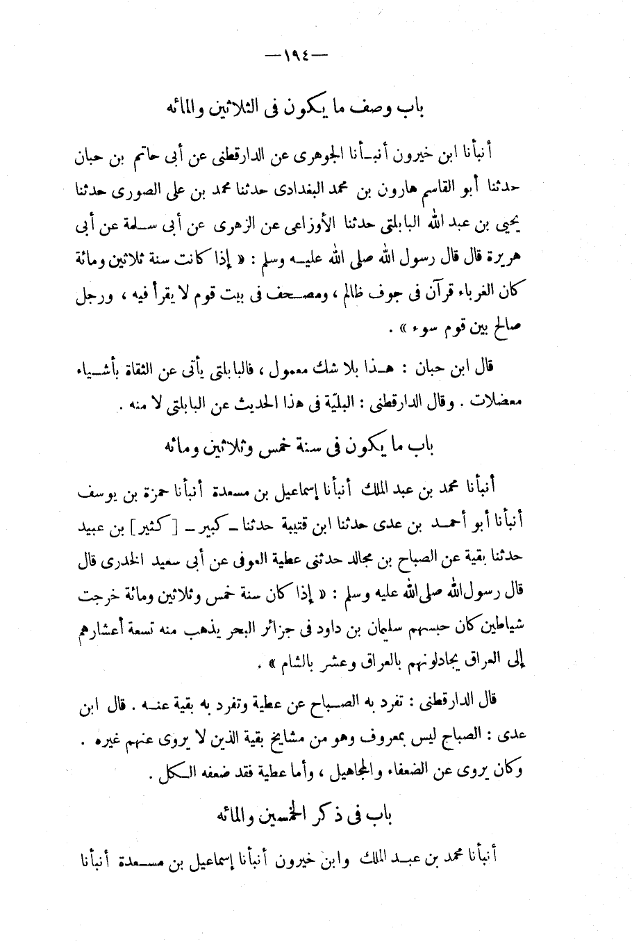 بَاب وصف مَا يَكُون فِي الثَّلَاثِينَ والمائه أَنْبَأَنَا ابْنُ خَيْرُونٍ أَنْبَأَنَا الْجَوْهَرِيُّ عَن الدَّارقطني عَن أبي حَاتِم بن حبَان حَدَّثَنَا أَبُو الْقَاسِمِ هَارُونُ بْنُ مُحَمَّدٍ الْبَغْدَادِيُّ حَدَّثَنَا مُحَمَّدُ بْنُ عَلِيٍّ الصُّورِيُّ حَدَّثَنَا يَحْيَى بْنُ عبد الله الْبَابْلُتِّيُّ حَدَّثَنَا الأَوْزَاعِيُّ عَنِ الزُّهْرِيِّ عَنْ أَبِي سَلَمَةَ عَنْ أَبِي هُرَيْرَةَ قَالَ قَالَ رَسُولُ اللَّهِ صَلَّى اللَّهُ عَلَيْهِ وَسَلَّمَ: " إِذَا كَانَتْ سَنَةُ ثَلاثِينَ وَمِائَةٍ كَانَ الغرباء قُرْآنٌ فِي جَوْفِ ظَالِمٍ، وَمُصْحَفٌ فِي بَيت قوم لايقرأ فِيهِ، وَرَجُلٌ