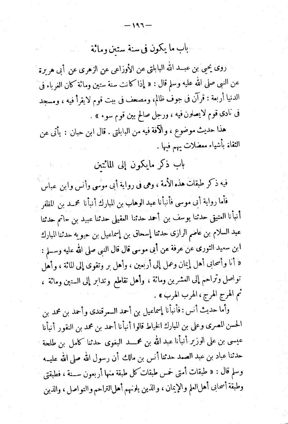 بَاب ذكر مَا يَكُون إِلَى الْمِائَتَيْنِ فِيهِ ذكر طَبَقَات هَذِه الْأمة، وَهِيَ فِي رِوَايَة أَبِي مُوسَى وَأنس وَابْن عَبَّاس فَأَما رِوَايَة أَبِي مُوسَى فَأَنْبَأَنَا عَبْدُ الْوَهَّابِ بْنُ الْمُبَارَكِ أَنْبَأَنَا مُحَمَّدُ بْنُ الْمُظَفَّرِ أَنْبَأَنَا الْعَتِيقِيُّ حَدَّثَنَا يُوسُفُ بْنُ أَحْمَدَ حَدَّثَنَا الْعُقَيْلِيُّ حَدَّثَنَا عُبَيْدُ بْنُ حَاتِمٍ حَدَّثَنَا عَبْدُ السَّلامِ بْنُ عَاصِمٍ الرَّازِيُّ حَدَّثَنَا إِسْحَاقُ بْنُ إِسْمَاعِيلَ بْنِ حَيَّوَيْهِ حَدثنَا الْمُبَارك ابْن سَعِيدٍ الثَّوْرِيُّ عَنْ عَرَفَةَ عَنْ أَبِي مُوسَى قَالَ قَالَ النَّبِيُّ صَلَّى اللَّهُ عَلَيْهِ وَسَلَّمَ: " أَنَا وَأَصْحَابِي أَهْلُ إِيمَانٍ وَعَمَلٍ إِلَى أَرْبَعِينَ، وَأَهْلُ بِرٍّ وَتَقْوَى إِلَى الْمِائَةِ، وَأَهْلُ تَوَاصُلٍ وَتَرَاحُمٍ إِلَى الْعِشْرِينَ وَمِائَةٍ، وَأَهْلُ تَقَاطُعٍ وِتَدَابُرٍ إِلَى السِّتِّينَ وَمِائَةٍ، ثُمَّ الْهَرْجُ الْهَرج، الْهَرَب الْهَرَب ".