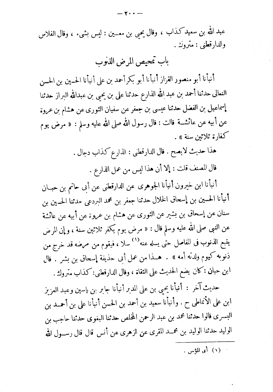 أَنْبَأَنَا ابْنُ خَيْرُونٍ أَنْبَأَنَا الْجَوْهَرِيُّ عَن الدَّارقطني عَن أبي حَاتِم بن حبَان أَنْبَأَنَا الْحُسَيْنُ بْنُ إِسْحَاقَ الْخَلالُ حَدَّثَنَا جَعْفَرُ بْنُ مُحَمَّدٍ الْبَرْدَعِيُّ حَدَّثَنَا الْحُسَيْنُ بْنُ سِنَانٍ عَنْ إِسْحَاقَ بْنِ بَشِيرٍ عَنِ الثَّوْرِيِّ عَنْ هِشَامِ بْنِ عُرْوَةَ عَنْ أَبِيهِ عَنْ عَائِشَةَ عَنِ النَّبِيِّ صَلَّى اللَّهُ عَلَيْهِ وَسَلَّمَ قَالَ: " مَرَضُ يَوْمٍ يُكَفِّرُ ثَلاثِينَ سَنَةً، وَإِنَّ الْمَرَضَ يَتَّبِعُ الذُّنُوبَ فِي الْمَفَاصِلِ حَتَّى يَسِّلَهُ عَنْهُ (1) سَلا، فَيَقُومُ مِنْ مَرَضِهِ قَدْ خَرَجَ مِنْ ذُنُوبِهِ كَيَوْمِ وَلَدَتْهُ أُمُّهُ ".