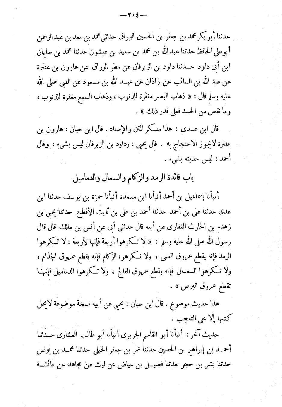 حَدَّثَنَا أَبُو بَكْرٍ مُحَمَّدُ بْنُ جَعْفَرِ بْنِ الْحُسَيْنِ الْوَرَّاقُ حَدَّثَنِي مُحَمَّد بن سعد بن عبد الرحمن أَبُو على الْحَافِظ حَدثنَا عبد الله بْنُ مُحَمَّدِ بْنِ سَعِيدِ بْنِ عَيْشُونٍ حَدَّثَنَا مُحَمَّدُ بْنُ سُلَيْمَانَ ابْن أَبِي دَاوُدَ حَدَّثَنَا دَاوُدُ بْنُ الزبر قان عَنْ مَطَرٍ الْوَرَّاقِ عَنْ هَارُونِ بن عنترة عَن عبد الله بْنِ السَّائِبِ عَنْ زَاذَانَ عَنْ عبد الله بْنِ مَسْعُودٍ عَنِ النَّبِيِّ صَلَّى اللَّهُ عَلَيْهِ وَسَلَّمَ قَالَ: " ذِهَابُ الْبَصَرِ مَغْفِرَةٌ لِلذُّنُوبِ، وَذِهَابُ السَّمَعِ مَغْفِرَةٌ لِلذِّنُوبِ، وَمَا نَقُصَ مِنَ الْحَسَدِ فَعَلَى قَدْرِ ذَلِكَ ".