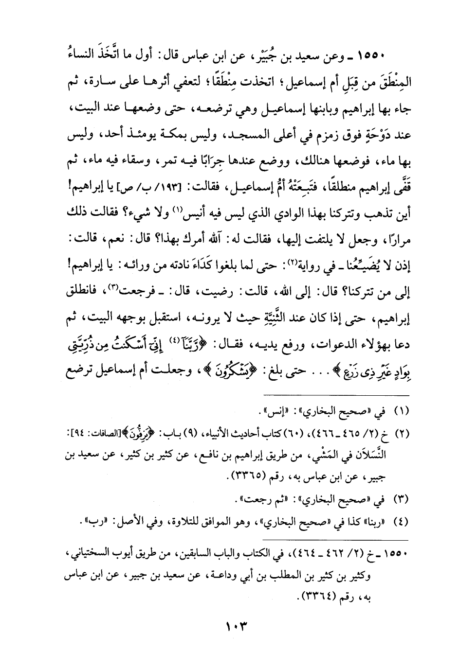 1550 - وعن سعيد بن جُبَيْر، عن ابن عباس قال: أول ما اتَّخَذَ النساءُ المِنْطَقَ من قِبَلِ أم إسماعيل؛ اتخذت مِنْطَقًا؛ لتعفي أثرها على سارة، ثم جاء بها إبراهيم وبابنها إسماعيل وهي ترضعه، حتى وضعها عند البيت، عند دَوْحَةٍ فوق زمزم في أعلى المسجد، وليس بمكة يومئذ أحد، وليس بها ماء، فوضعها هنالك، ووضع عندها جِرَابًا فيه تمر، وسقاء فيه ماء، ثم قَفَّى إبراهيم منطلقًا، فتَبِعَتْهُ أمُّ إسماعيل، فقالت: يا إبراهيم! أين تذهب وتتركنا بهذا الوادي الذي ليس فيه أنيس (¬1) ولا شيء؟ فقالت ذلك مرارًا، وجعل لا يلتفت إليها، فقالت له: آللَّه أمرك بهذا؟ قال: نعم، قالت: إذن لا يُضَيِّعنا -في رواية (¬2): حتى لما بلغوا كَدَاءَ نادته من ورائه: يا إبراهيم! إلى من تتركنا؟ قال: إلى اللَّه، قالت: رضيت، قال: - فرجعت (¬3)، فانطلق إبراهيم، حتى إذا كان عند الثَّنِيَّةِ حيث لا يرونه، استقبل بوجهه البيت، ثم دعا بهؤلاء الدعوات، ورفع يديه، فقال: {رَبَّنَا (¬4) إِنِّي أَسْكَنْتُ مِنْ ذُرِّيَّتِي بِوَادٍ غَيْرِ ذِي زَرْعٍ}. . . حتى بلغ: {يَشْكُرُونَ}، وجعلت أم إسماعيل ترضع