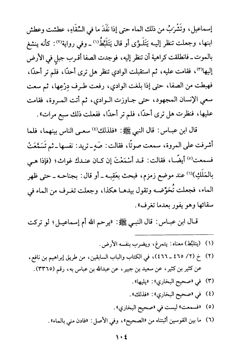 قال ابن عباس: قال النبي -صلى اللَّه عليه وسلم-: "يرحم اللَّه أم إسماعيل؛ لو تركت