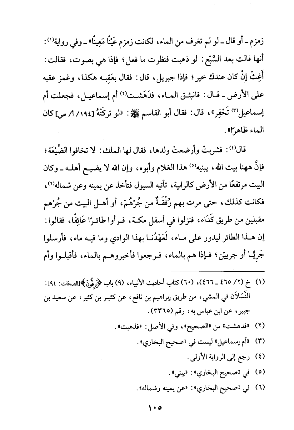 زمزم -أو قال- لو لم تغرف من الماء، لكانت زمزم عَيْنًا مَعِينًا" -وفي رواية (¬1): أنها قالت بعد السَّبعْ: لو ذهبت فنظرت ما فعل؛ فإذا هي بصوت، فقالت: أَغِثْ إنْ كان عندك خير؛ فإذا جبريل، قال: فقال بعَقِبه هكذا، وغمز عقبه على الأرض- قال: فانبثق الماء، فدَهَشت (¬2) أم إسماعيل، فجعلت أم إسماعيل (¬3) تَحْفِر"، قال: فقال أبو القاسم -صلى اللَّه عليه وسلم-: "لو تركَتْهُ كان الماء ظاهرًا".