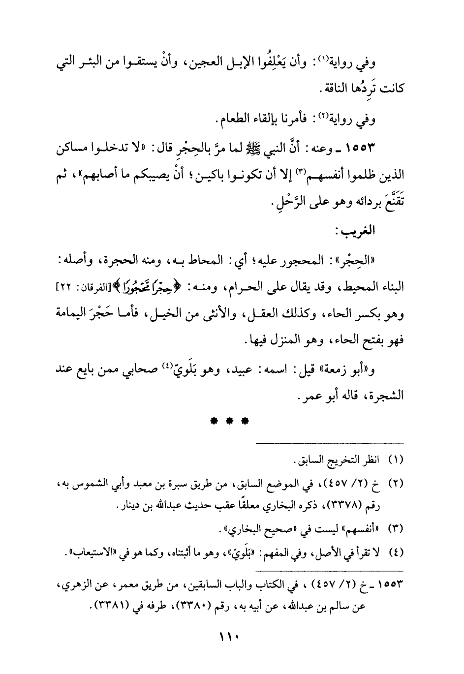 1553 - وعنه: أنَّ النبي -صلى اللَّه عليه وسلم- لما مرَّ بالحِجْرِ قال: "لا تدخلوا مساكن الذين ظلموا أنفسهم (¬3) إلا أن تكونوا باكين؛ أنْ يصيبكم ما أصابهم"، ثم تَقَنَّعَ بردائه وهو على الرَّحْلِ.
