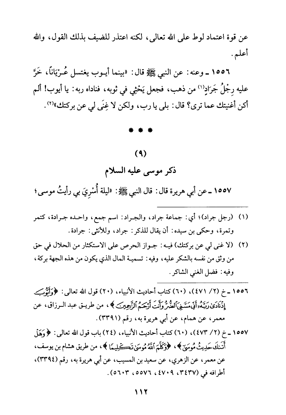 1556 - وعنه: عن النبي -صلى اللَّه عليه وسلم- قال: "بينما أيوب يغتسل عُرْيَانًا، خَرَّ عليه رِجْلُ جَرَادٍ (¬1) من ذهب، فجعل يَحْثِي في ثوبه، فناداه ربه: يا أيوب! ألم أكن أغنيتك عما ترى؟ قال: بلى يا رب، ولكن لا غِنَى لي عن بركتك" (¬2).