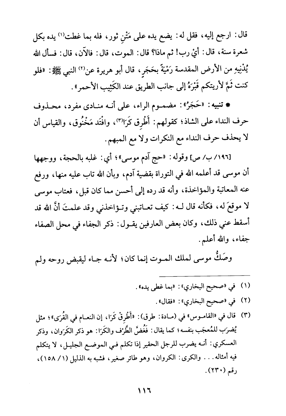 قال: ارجع إليه، فقل له: يضع يده على مَتْنِ ثور، فله بما غطت (¬1) يده بكل شعرة سنة، قال: أيْ رب! ثمَّ ماذا؟ قال: الموت، قال: فالآن، قال: فسأل اللَّه يُدْنِيهِ من الأرض المقدسة رَمْيَةً بحَجَرٍ، قال أبو هريرة عن (¬2) النبي -صلى اللَّه عليه وسلم-: "فلو كنت ثَمَّ لأريتكم قَبْرَهُ إلى جانب الطريق عند الكَثِيب الأحمر".