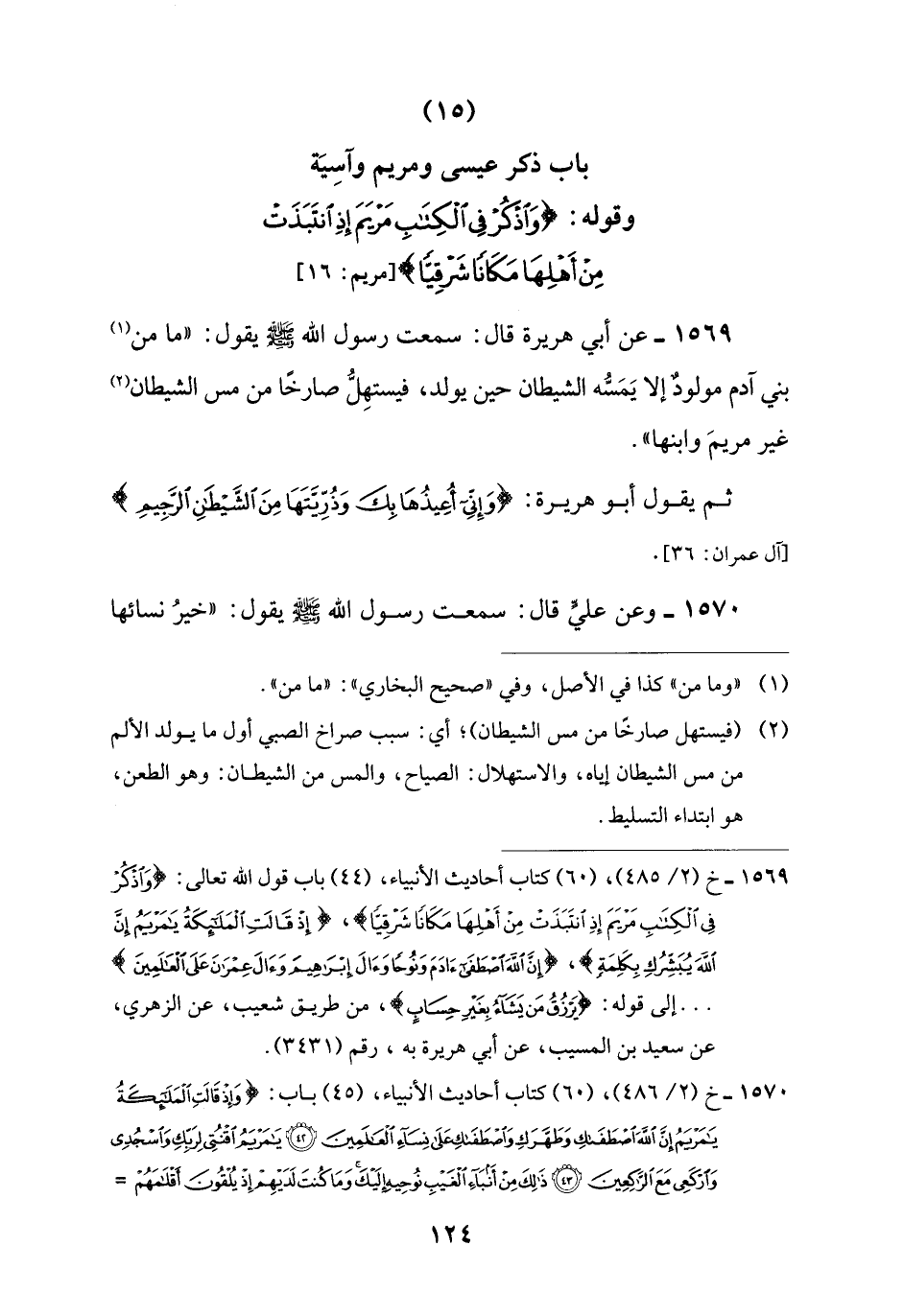 (15) باب ذكر عيسى ومريم وآسِيَة وقوله: {وَاذْكُرْ فِي الْكِتَابِ مَرْيَمَ إِذِ انْتَبَذَتْ مِنْ أَهْلِهَا مَكَانًا شَرْقِيًّا} [مريم: 16]