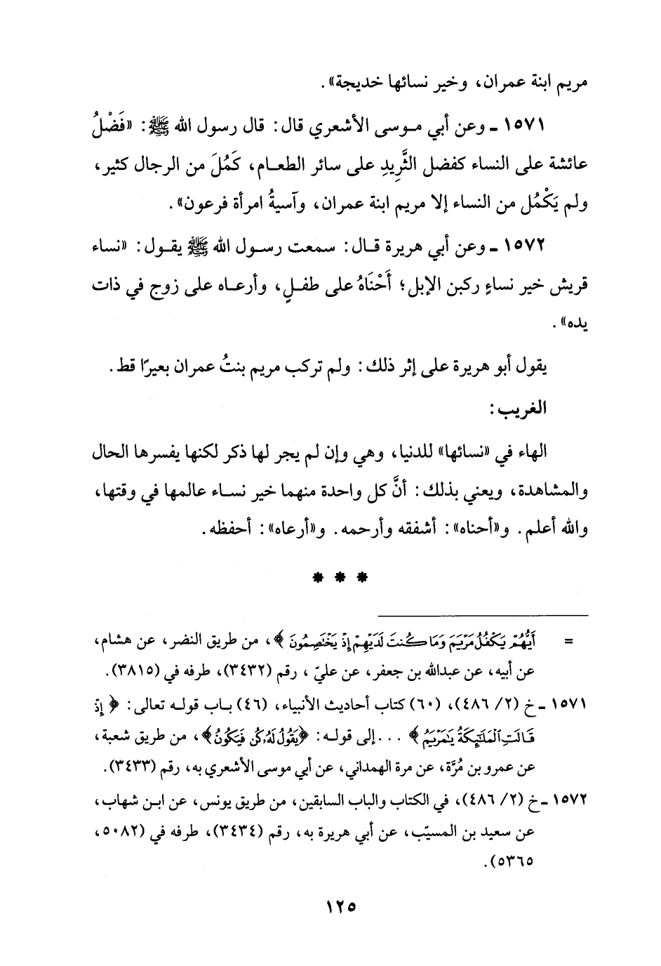 1572 - وعن أبي هريرة قال: سمعت رسول اللَّه -صلى اللَّه عليه وسلم- يقول: "نساء قريش خير نساءٍ ركبن الإبل؛ أَحْنَاهُ على طفلٍ، وأرعاه على زوج في ذات يده".