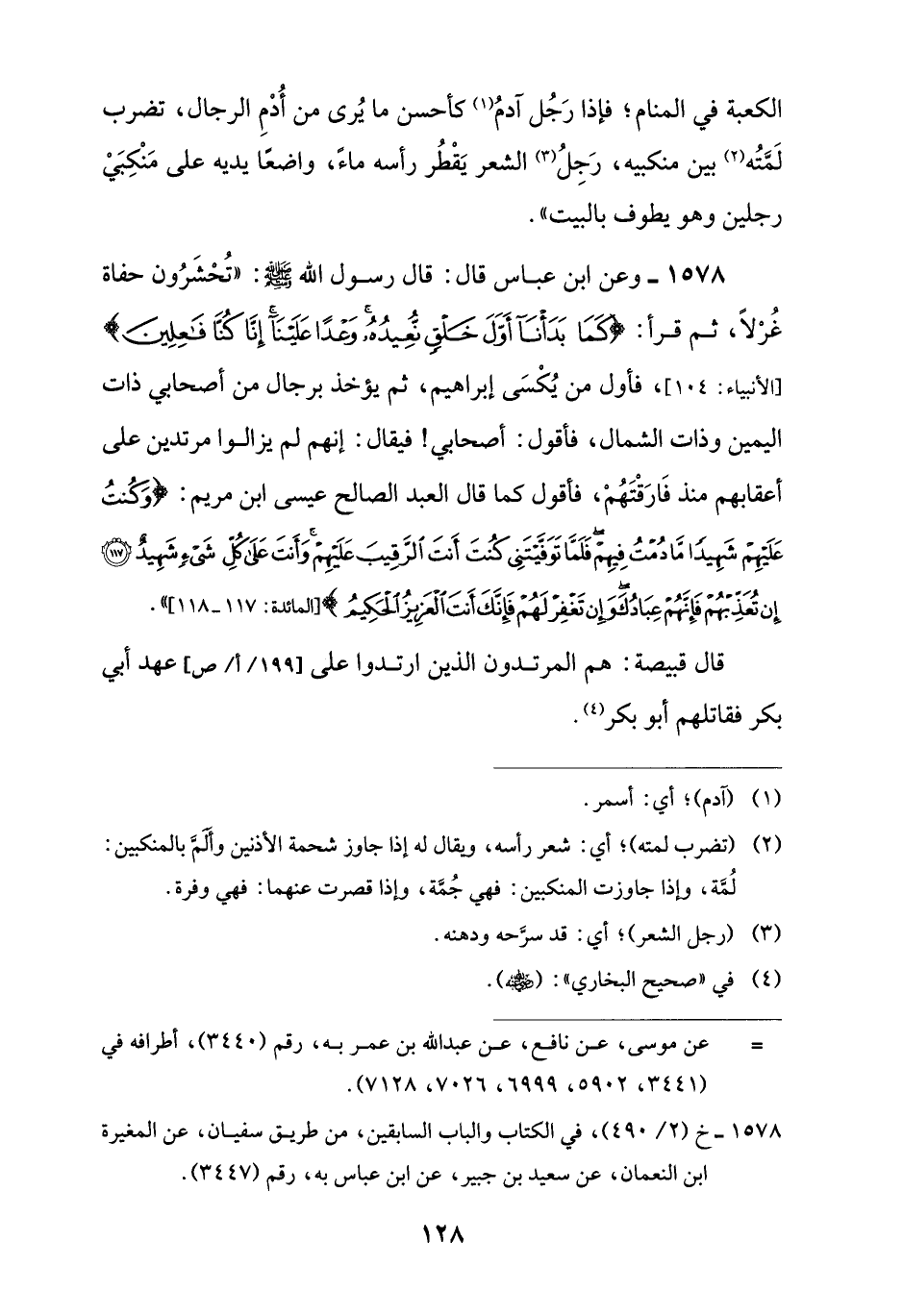 1578 - وعن ابن عباس قال: قال رسول اللَّه -صلى اللَّه عليه وسلم-: "تُحْشَرُون حفاة غُرْلًا، ثمَّ قرأ: {كَمَا بَدَأْنَا أَوَّلَ خَلْقٍ نُعِيدُهُ وَعْدًا عَلَيْنَا إِنَّا كُنَّا فَاعِلِينَ} [الأنبياء: 104]، فأول من يُكْسَى إبراهيم، ثمَّ يؤخذ برجال من أصحابي ذات اليمين وذات الشمال، فأقول: أصحابي! فيقال: إنهم لم يزالوا مرتدين على أعقابهم منذ فَارَقْتَهُمْ، فأقول كما قال العبد الصالح عيسى ابن مريم: {وَكُنْتُ عَلَيْهِمْ شَهِيدًا مَا دُمْتُ فِيهِمْ فَلَمَّا تَوَفَّيْتَنِي كُنْتَ أَنْتَ الرَّقِيبَ عَلَيْهِمْ وَأَنْتَ عَلَى كُلِّ شَيْءٍ شَهِيدٌ (117) إِنْ تُعَذِّبْهُمْ فَإِنَّهُمْ عِبَادُكَ وَإِنْ تَغْفِرْ لَهُمْ فَإِنَّكَ أَنْتَ الْعَزِيزُ الْحَكِيمُ} [المائدة: 117 - 118] ".