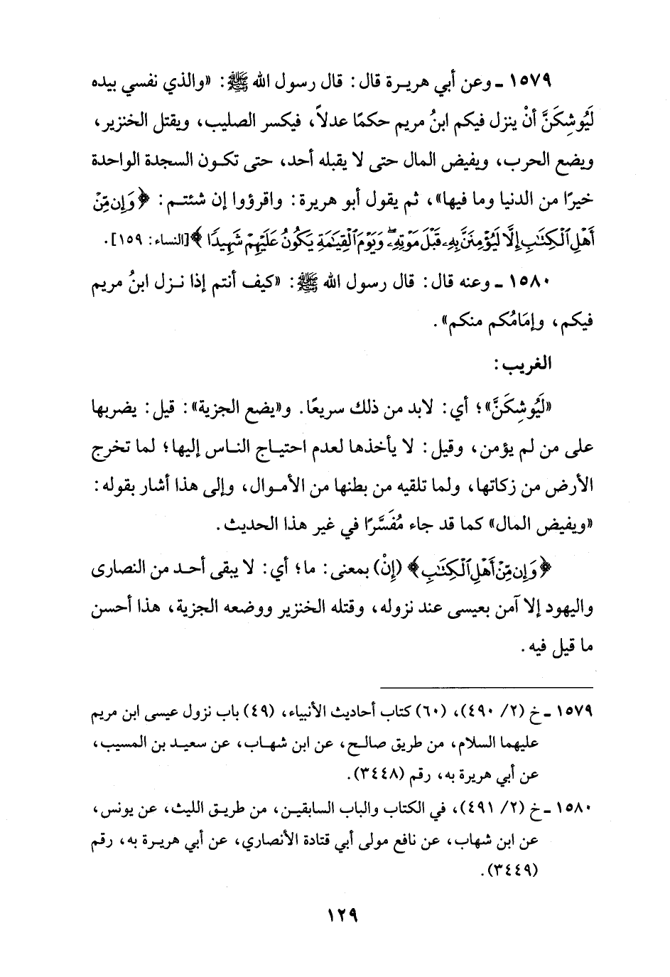 1579 - وعن أبي هريرة قال: قال رسول اللَّه -صلى اللَّه عليه وسلم-: "والذي نفسي بيده لَيُوشِكَنَّ أنْ ينزل فيكم ابنُ مريم حكمًا عدلًا، فيكسر الصليب، ويقتل الخنزير، ويضع الحرب، ويفيض المال حتى لا يقبله أحد، حتى تكون السجدة الواحدة خيرًا من الدنيا وما فيها"، ثمَّ يقول أبو هريرة: واقرؤوا إن شئتم: {وَإِنْ مِنْ أَهْلِ الْكِتَابِ إِلَّا لَيُؤْمِنَنَّ بِهِ قَبْلَ مَوْتِهِ وَيَوْمَ الْقِيَامَةِ يَكُونُ عَلَيْهِمْ شَهِيدًا} [النساء: 159].