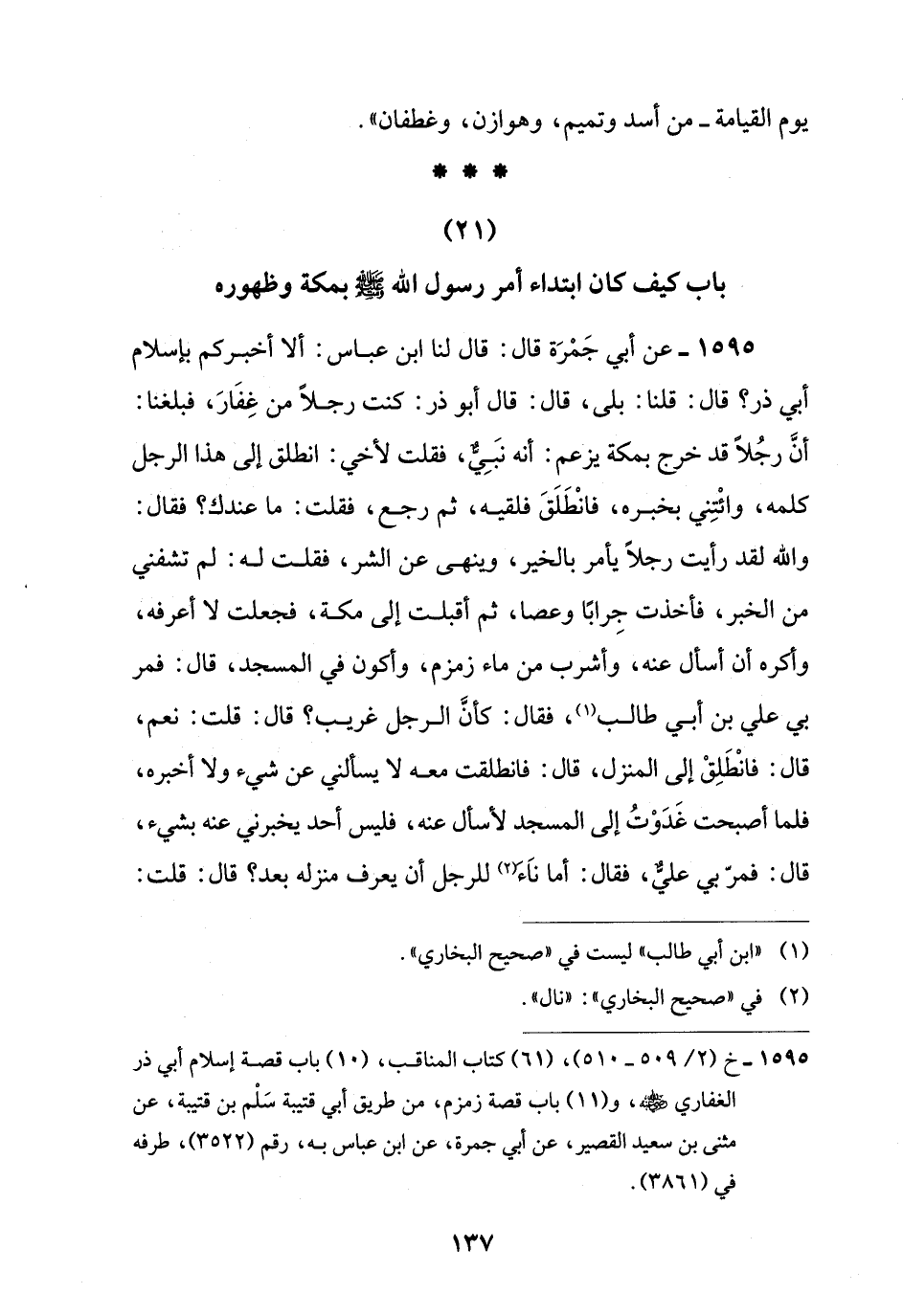 1595 - خ (2/ 509 - 510)، (61) كتاب المناقب، (10) باب قصة إسلام أبي ذر الغفاري -رضي اللَّه عنه-، و (11) باب قصة زمزم، من طريق أبي قتيبة سَلْم بن قتيبة، عن مثنى بن سعيد القصير، عن أبي جمرة، عن ابن عباس به، رقم (3522)، طرفه في (3861).