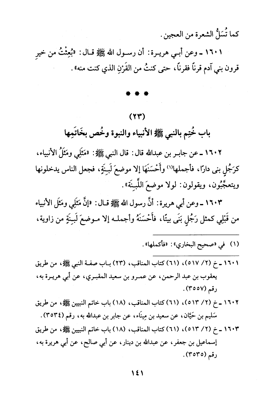 1603 - خ (2/ 513)، (61) كتاب المناقب، (18) باب خاتم النبيين -صلى اللَّه عليه وسلم-، من طريق إسماعيل بن جعفر، عن عبد اللَّه بن دينار، عن أبي صالح، عن أبي هريرة به، رقم (3535).