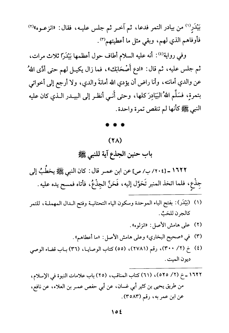 1622 - عن ابن عمر قال: كان النبي -صلى اللَّه عليه وسلم- يخطُبُ إلى جِذْعٍ، فلما اتخذ المنبر تَحَوَّل إليه، فَحَنَّ الجِذْعُ، فأتاه فمسح يده عليه.
