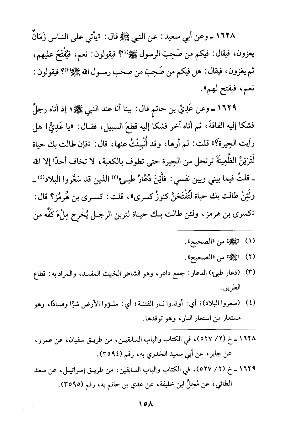 1629 - وعن عَدِيِّ بن حاتمٍ قال: بينا أنا عند النبي -صلى اللَّه عليه وسلم-؛ إذ أتاه رجلٌ فشكا إليه الفاقةَ، ثمَّ أتاه آخر فشكا إليه قطعَ السبيل، فقال: "يا عَدِيُّ! هل رأيت الحِيرةَ؟ " قلت: لم أرها، وقد أُنْبِئْتُ عنها، قال: "فإن طالت بك حياة لَتَرَيَنَّ الظَّعِينَةَ ترتحل من الحِيرة حتى تطوف بالكعبة، لا تخاف أحدًا إلا اللَّه -قلتُ فيما بيني وبين نفسي: فأَيْنَ دُعَّارُ طيئ (¬3) الذين قد سَعَّروا البلاد (¬4) - ولَئِنْ طالت بك حياة لَتُفْتَحَنَّ كنوزُ كسرى"، قلت: كسرى بن هُرمُز؟ قال: "كسرى بن هرمز، ولئن طالت بك حياة لترين الرجل يُخْرِج مِلْءَ كَفِّه من