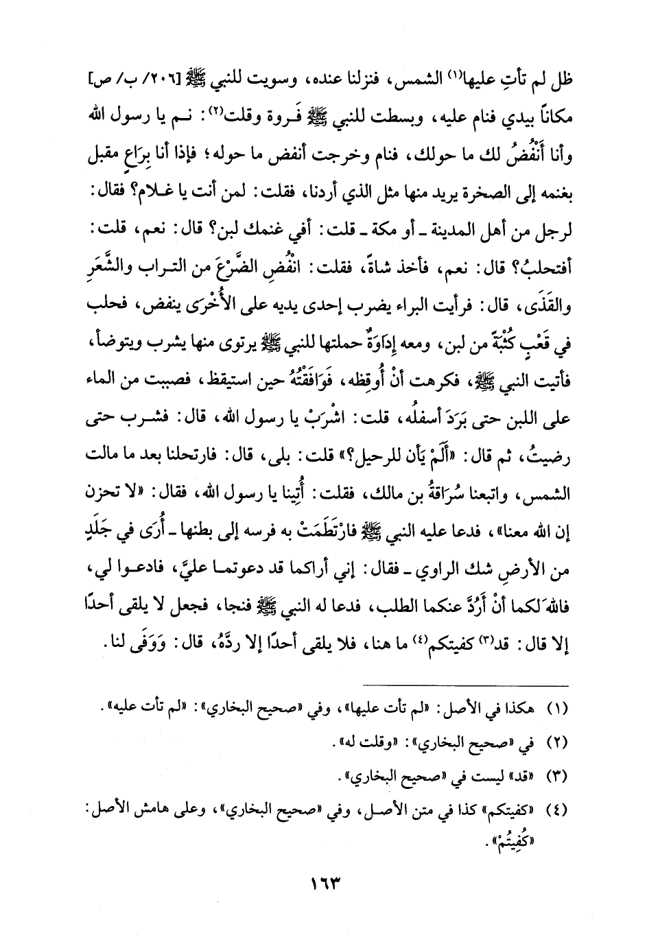 ظل لم تأتِ عليها (¬1) الشمس، فنزلنا عنده، وسويت للنبي -صلى اللَّه عليه وسلم- مكانًا بيدي فنام عليه، وبسطت للنبي -صلى اللَّه عليه وسلم- فَروة وقلت (¬2): نم يا رسول اللَّه وأنا أَنْفُضُ لك ما حولك، فنام وخرجت أنفض ما حوله؛ فإذا أنا بِرَاعٍ مقبل بغنمه إلى الصخرة يريد منها مثل الذي أردنا، فقلت: لمن أنت يا غلام؟ فقال: لرجل من أهل المدينة -أو مكة- قلت: أفي غنمك لبن؟ قال: نعم، قلت: أفتحلبُ؟ قال: نعم، فأخذ شاةً، فقلت: انْفُضِ الضَّرْعَ من التراب والشَّعَرِ والقَذَى، قال: فرأيت البراء يضرب إحدى يديه على الأُخْرى ينفض، فحلب في قَعْبٍ كُثْبَةً من لبن، ومعه إِدَاوَةٌ حملتها للنبي -صلى اللَّه عليه وسلم- يرتوى منها يشرب ويتوضأ، فأتيت النبي -صلى اللَّه عليه وسلم-، فكرهت أنْ أُوقِظه، فَوَافَقْتُهُ حين استيقظ، فصببت من الماء على اللبن حتى بَرَدَ أسفلُه، قلت: اشْرَبْ يا رسول اللَّه، قال: فشرب حتى رضيتُ، ثم قال: "ألمْ يَأن للرحيل؟ " قلت: بلى، قال: فارتحلنا بعد ما مالت الشمس، واتبعنا سُرَاقةُ بن مالك، فقلت: أُتِينا يا رسول اللَّه، فقال: "لا تحزن إن اللَّه معنا"، فدعا عليه النبي -صلى اللَّه عليه وسلم- فارْتَطَمَتْ به فرسه إلى بطنها -أُرَى في جَلَدٍ من الأرضِ شك الراوي- فقال: إني أراكما قد دعوتما عليَّ، فادعوا لي، فاللَّهَ لكما أنْ أَرُدَّ عنكما الطلب، فدعا له النبي -صلى اللَّه عليه وسلم- فنجا، فجعل لا يلقى أحدًا إلا قال: قد (¬3) كفيتكم (¬4) ما هنا، فلا يلقى أحدًا إلا ردَّهُ، قال: وَوَفَى لنا.