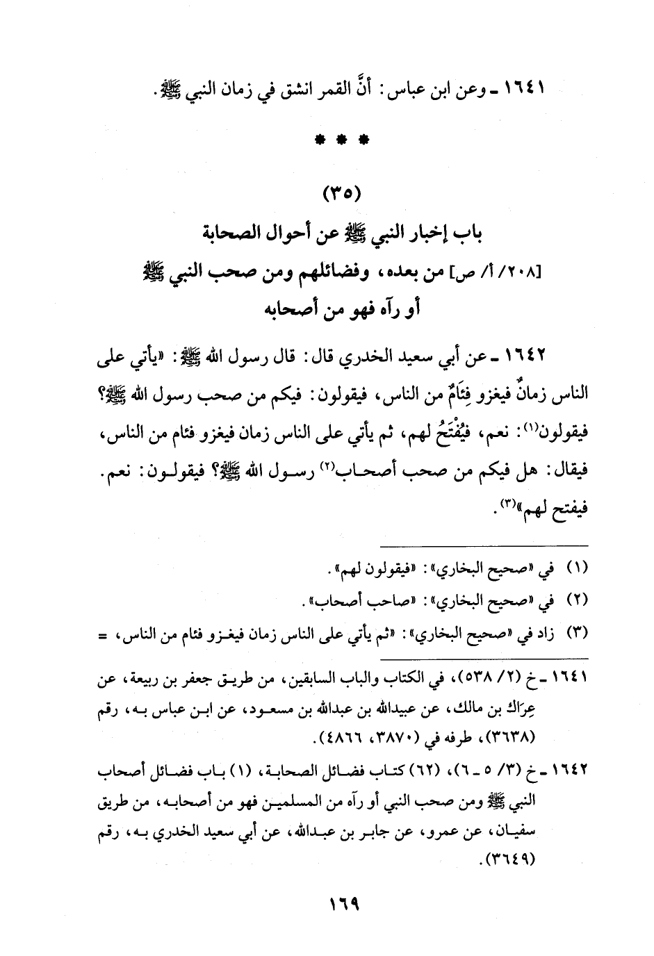 1642 - خ (3/ 5 - 6)، (62) كتاب فضائل الصحابة، (1) باب فضائل أصحاب النبي -صلى اللَّه عليه وسلم- ومن صحب النبي أو رآه من المسلمين فهو من أصحابه، من طريق سفيان، عن عمرو، عن جابر بن عبد اللَّه، عن أبي سعيد الخدري به، رقم (3649).